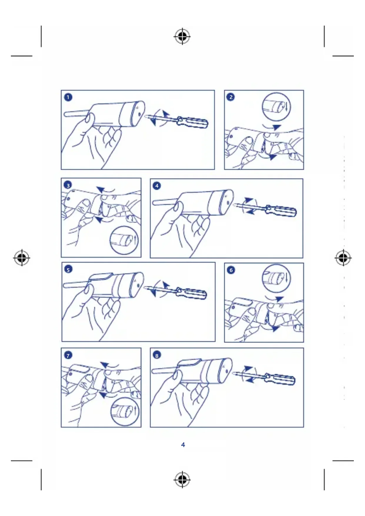 overeenstemming met de po- lariteit die in de batterijenhou- der aangegeven is. Breng de sluitklep op de alka- line batterijenhouder (8) aan door eerst de haken aan te brengen en het zachtjes in de richting tegengesteld aan die van de pijl te duwen (afb.3). Draai tenslotte de sluitklep weer vast (afb.4).