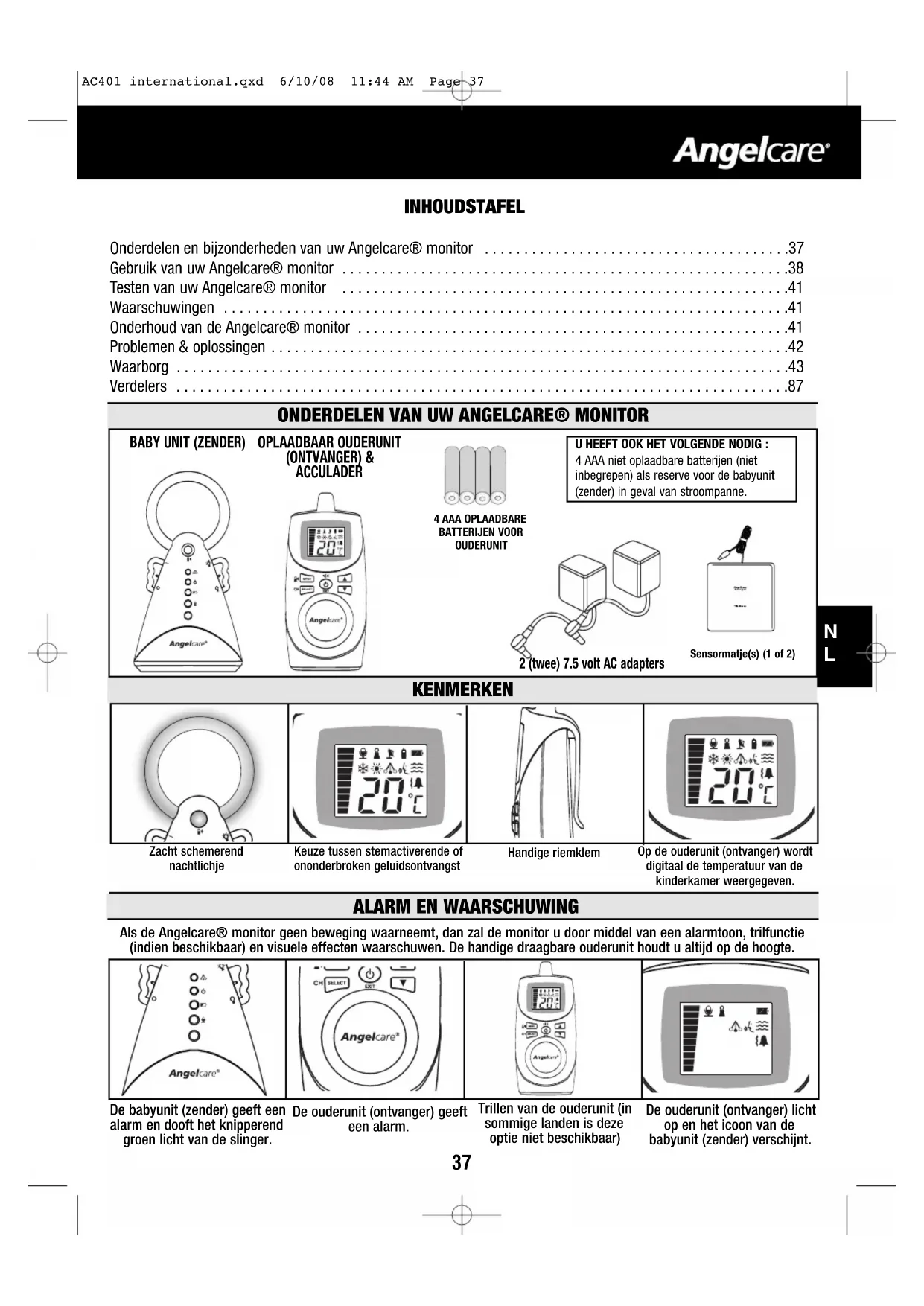 BEPERKTE GARANTIE Angelcare® garandeert de oorspronkelijke eigenaar van dit product dat de Angelcare® oplaadbare geluid en bewegingsmonitor (model AC401) vrij is van fouten in materiaal en uitvoering, voor een periode van een (1) jaar vanaf de oorspronkelijke aankoopdatum. Als dit monitoring systeem niet juist functioneert wanneer gebruikt volgens de richtlijnen in normale condities binnen een periode van één jaar, dan zal Angelcare® het product kosteloos herstellen of vervangen, naar eigen oordeel. Neem a.u.b. contact op met uw verdeler. Het product moet vergezeld zijn van het aankoopbewijs, ofwel een verkoopbon of een ander bewijs dat de monitor onder de garantieperiode valt. Angelcare® zal de kosten voor herstelling of vervanging en de verzendkosten voor haar rekening nemen. Deze garantie is niet van toepassing op een product beschadigd als gevolg van verkeerd onderhoud, een ongeval, verkeerde elektrische voeding of enig andere vorm van misbruik. De garantie vervalt ook als de eigenaar het product op eender welke manier herstelt of wijzigt. Angelcare® is niet aansprakelijk voor directe of indirecte schade met betrekking tot dit product. De garantie sluit elke andere aansprakelijkheid uit buiten hetgeen hierboven vermeld. Geen enkele ander garantie wordt verleend. WETTELIJKE RECHTEN VARIEREN VAN LAND TO LAND. SOMMIGE LANDEN LATEN DE UITSLUITING OF BEPERKING VAN DIRECTE OF INDIRECTE SCHADE NIET TOE, HET IS MOGELIJK DAT DE BOVENVERMELDE BEPERKINGEN NIET OP U VAN TOEPASSING ZIJN. WIJ ZIJN IN GEEN ENKEL OPZICHT VERANTWOORDELIJK VOOR DE GEVOLGEN VERBONDEN AAN HET GEBRUIK VAN DIT PRODUCT. BELANGRIJK! Deze Angelcare® monitor is een product voor persoonlijke zorg. Breng dit product niet terug naar de winkel. Als u vragen heeft of als u hulp nodig heeft, contacteer uw verdeler vooraleer dit product terug te brengen. Dit apparaat voldoet aan Deel 15 van de FCC Regels. Het gebruik ervan is gebonden aan de twee volgende voorwaarden: (1) dit apparaat mag geen schadelijke interferentie veroorzaken; en (2) dit apparaat moet alle ontvangen interferentie aannemen, met inbegrip van interferentie die ongewenst is voor de werking. WAARSCHUWING: Wijzigingen of modificaties aan dit apparaat die niet expliciet goedgekeurd zijn door de partij verantwoordelijk voor de wettelijke naleving kunnen het gebruiksrecht nietig maken. NOTA: Dit apparaat werd getest en in overeenstemming bevonden met de limieten van een Klas B digitaal apparaat, volgens Deel 15 van de FCC Regels. Deze limieten werden vastgesteld om redelijke bescherming te bieden tegen schadelijke interferentie in een residentiele installatie. Dit apparaat genereert, gebruikt en kan radiofrekwentie energie uitstralen en indien niet geinstalleerd en gebruikt volgens de instructies, kan schadelijke interferentie veroorzaken voor radiocommunicaties. Er wordt echter niet gegarandeerd dat een specifieke installatie geen interferentie zal veroorzaken. Als dit apparaat schadelijke interferentie veroorzaakt voor radio of televisie ontvangst, die men vaststelt door het apparaat aan en uit te draaien, wordt de gebruiker aangespoord om te trachten de interferentie te verhelpen door een van de volgende maatregelen: - Heroriënteer of verplaats de ontvangstantenne. - Vergroot de afstand tussen apparaat en ontvanger. - Sluit het apparaat aan in een stopcontact behorende tot een andere elektrische kring dan de ontvanger. - Raadpleeg de verdeler of een ervaren radio/TV technieker voor hulp. VOORZICHTIG: - Om het gevaar van elektrische schokken te reduceren, stel dit apparaat niet bloot aan regen of vocht. - Ontploffingsgevaar als de batterij niet juist vervangen wordt. De inbegrepen batterijen zijn 4 AAA NIMH oplaadbare batterijen gemaakt door Sanik Battery Co. Ltd. SN-AAA60HJ 1.2 V 600mAh of GPI International Limited, GN60AAAHC, 1.2V 600mAh. Ze mogen enkel vervangen worden door 4 AAA NIMH oplaadbare batterijen. Uitzending: 927 MHz (USA en Canada) 864 MHz (Europa, Azië, Africa, Oceanië). De gegevensuitwisseling tussen de ouderunit en de babykamer unit geschiedt op 2.4GHz frekwentie. Bescherm het milieu! Dit elektronische apparaat bevat materiaal geschikt voor hergebruik en mag niet bij huishoudafval gegooid worden. Breng het a.u.b. naar een recycleerplaats voor elektronische a pparatuur (vraag de plaatselijke autoriteiten voor details). AC401 international.qxd 6/10/08 11:44 AM Page 4344