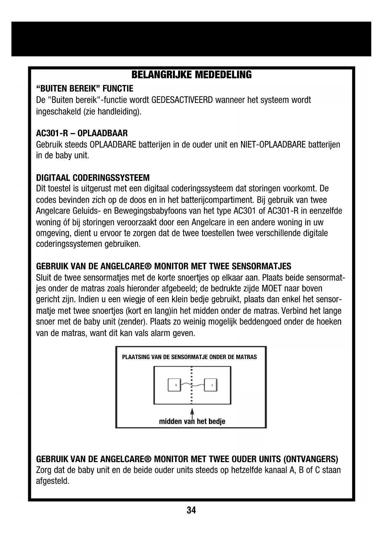 Gebruik steeds OPLAADBARE batterijen in de ouder unit en NIET-OPLAADBARE batterijen in de baby unit. DIGITAAL CODERINGSSYSTEEM Dit toestel is uitgerust met een digitaal coderingssysteem dat storingen voorkomt. De codes bevinden zich op de doos en in het batterijcompartiment. Bij gebruik van twee Angelcare Geluids- en Bewegingsbabyfoons van het type AC301 of AC301-R in eenzelfde woning óf bij storingen veroorzaakt door een Angelcare in een andere woning in uw omgeving, dient u ervoor te zorgen dat de twee toestellen twee verschillende digitale coderingssystemen gebruiken. GEBRUIK VAN DE ANGELCARE® MONITOR MET TWEE SENSORMATJES Sluit de twee sensormatjes met de korte snoertjes op elkaar aan. Plaats beide sensormat- jes onder de matras zoals hieronder afgebeeld; de bedrukte zijde MOET naar boven gericht zijn. Indien u een wiegje of een klein bedje gebruikt, plaats dan enkel het sensor- matje met twee snoertjes (kort en lang)in het midden onder de matras. Verbind het lange snoer met de baby unit (zender). Plaats zo weinig mogelijk beddengoed onder de hoeken van de matras, want dit kan vals alarm geven. GEBRUIK VAN DE ANGELCARE® MONITOR MET TWEE OUDER UNITS (ONTVANGERS) Zorg dat de baby unit en de beide ouder units steeds op hetzelfde kanaal A, B of C staan afgesteld. PLAATSING VAN DE SENSORMATJE ONDER DE MATRAS midden van het bedje 34Model # AC301