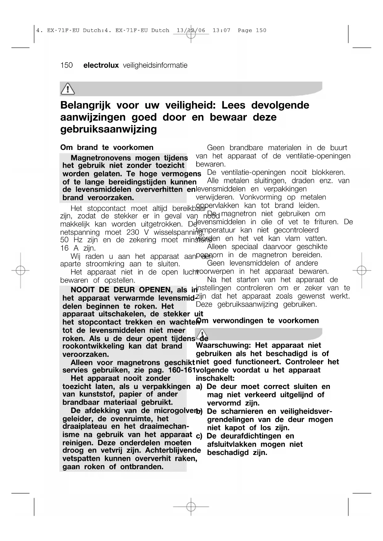 Belangrijk voor uw veiligheid: Lees devolgende aanwijzingen goed door en bewaar deze gebruiksaanwijzing Om brand te voorkomen Magnetronovens mogen tijdens het gebruik niet zonder toezicht worden gelaten. Te hoge vermogens of te lange bereidingstijden kunnen de levensmiddelen oververhitten en brand veroorzaken. Het stopcontact moet altijd bereikbaar zijn, zodat de stekker er in geval van nood makkelijk kan worden uitgetrokken. De netspanning moet 230 V wisselspanning, 50 Hz zijn en de zekering moet minstens 16 A zijn. Wij raden u aan het apparaat aan een aparte stroomkring aan te sluiten. Het apparaat niet in de open lucht bewaren of opstellen. NOOIT DE DEUR OPENEN, als in het apparaat verwarmde levensmid- delen beginnen te roken. Het apparaat uitschakelen, de stekker uit het stopcontact trekken en wachten tot de levensmiddelen niet meer roken. Als u de deur opent tijdens de rookontwikkeling kan dat brand veroorzaken. Alleen voor magnetrons geschikt servies gebruiken, zie pag. 160-161. Het apparaat nooit zonder toezicht laten, als u verpakkingen van kunststof, papier of ander brandbaar materiaal gebruikt. De afdekking van de microgolven- geleider, de ovenruimte, het draaiplateau en het draaimechan- isme na gebruik van het apparaat reinigen. Deze onderdelen moeten droog en vetvrij zijn. Achterblijvende vetspatten kunnen oververhit raken, gaan roken of ontbranden. Geen brandbare materialen in de buurt van het apparaat of de ventilatie-openingen bewaren. De ventilatie-openingen nooit blokkeren. Alle metalen sluitingen, draden enz. van levensmiddelen en verpakkingen verwijderen. Vonkvorming op metalen oppervlakken kan tot brand leiden. De magnetron niet gebruiken om levensmiddelen in olie of vet te frituren. De temperatuur kan niet gecontroleerd worden en het vet kan vlam vatten. Alleen speciaal daarvoor geschikte popcorn in de magnetron bereiden. Geen levensmiddelen of andere voorwerpen in het apparaat bewaren. Na het starten van het apparaat de instellingen controleren om er zeker van te zijn dat het apparaat zoals gewenst werkt. Deze gebruiksaanwijzing gebruiken. Om verwondingen te voorkomen Waarschuwing: Het apparaat niet gebruiken als het beschadigd is of niet goed functioneert. Controleer het volgende voordat u het apparaat inschakelt: a) De deur moet correct sluiten en mag niet verkeerd uitgelijnd of vervormd zijn. b) De scharnieren en veiligheidsver- grendelingen van de deur mogen niet kapot of los zijn. c) De deurafdichtingen en afsluitvlakken mogen niet beschadigd zijn.