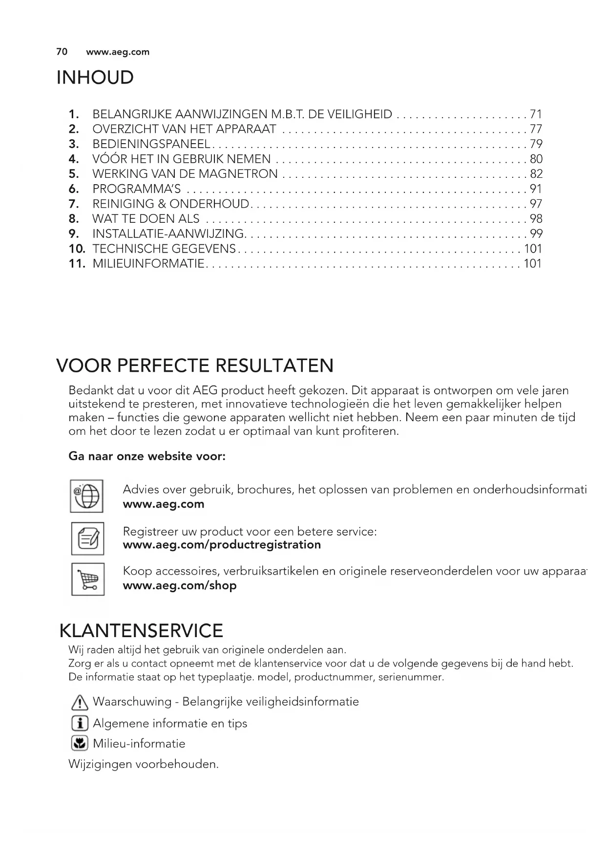 Bedankt dat u voor dit AEG product heeft gekozen. Dit apparaat is ontworpen om vele jaren uitstekend te presteren, met innovatieve technologieën die het leven gemakkelijker helpen maken – functies die gewone apparaten wellicht niet hebben. Neem een paar minuten de tijd om het door te lezen zodat u er optimaal van kunt proteren. Ga naar onze website voor: KLANTENSERVICE Wij raden altijd het gebruik van originele onderdelen aan. Zorg er als u contact opneemt met de klantenservice voor dat u de volgende gegevens bij de hand hebt. De informatie staat op het typeplaatje. model, productnummer, serienummer. Wijzigingen voorbehouden. Waarschuwing - Belangrijke veiligheidsinformatie Algemene informatie en tips Milieu-informatie Advies over gebruik, brochures, het oplossen van problemen en onderhoudsinformatie: www.aeg.com Registreer uw product voor een betere service: www.aeg.com/productregistration Koop accessoires, verbruiksartikelen en originele reserveonderdelen voor uw apparaat: www.aeg.com/shop 3_AEG_Dutch_MG_AF14_Layout 1 13/11/2014 08:30 Page 7071 NEDERLANDS