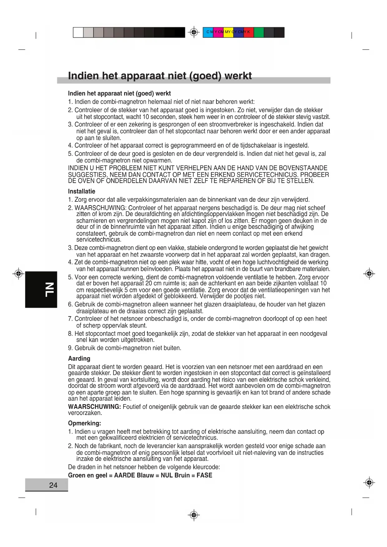 de combi-magnetron of enig persoonlijk letsel dat voortvloeit uit niet-naleving van de instructies inzake de elektrische aansluiting van het apparaat. De draden in het netsnoer hebben de volgende kleurcode: Groen en geel = AARDE Blauw = NUL Bruin = FASEC M Y CM MY CY CMY K