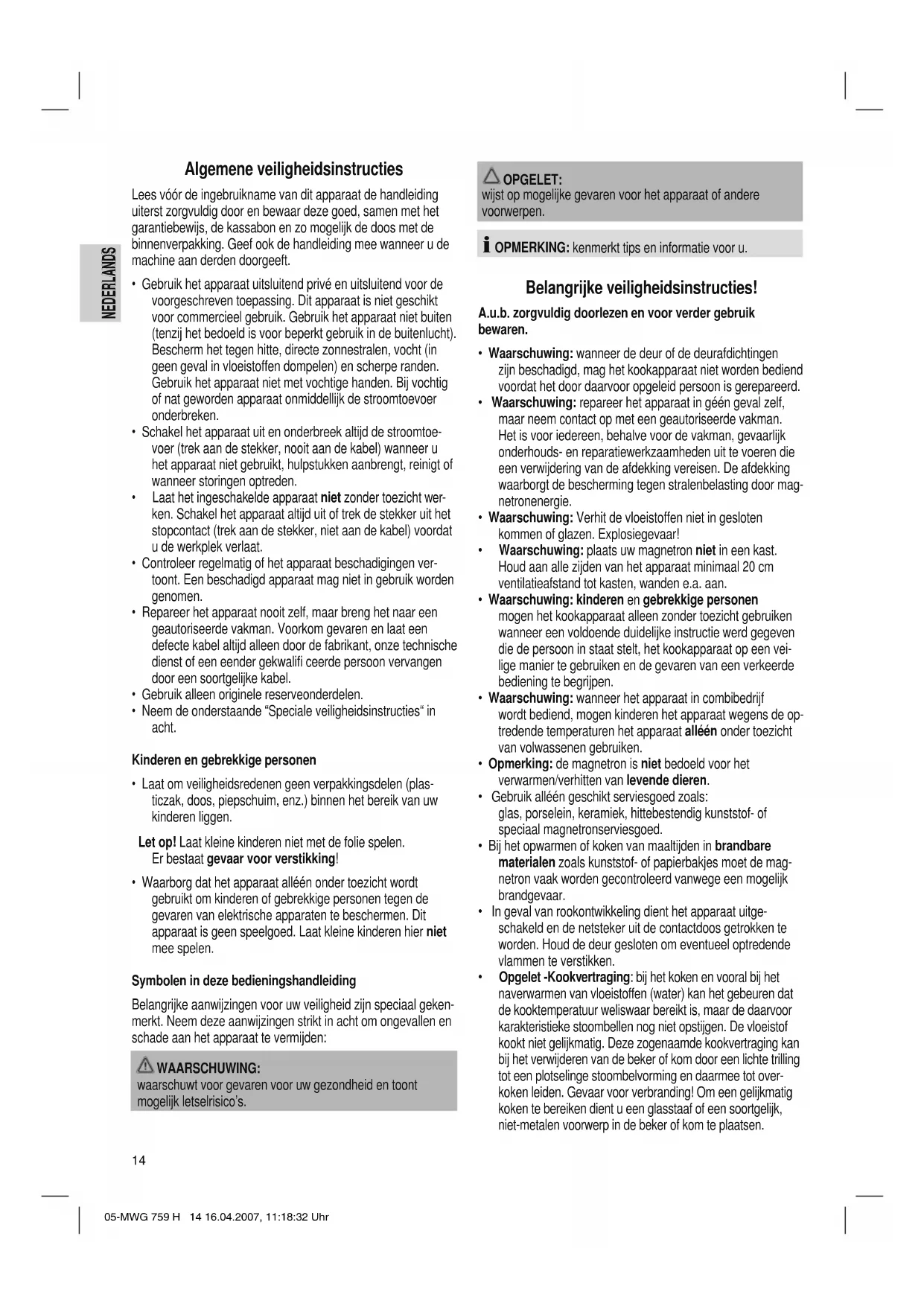 - Bedien het apparaat in de magnetronmodus nooit leeg. 05-MWG 759 H 15 16.04.2007, 11:18:34 Uhr16 NEDERLANDS NEDERLANDS