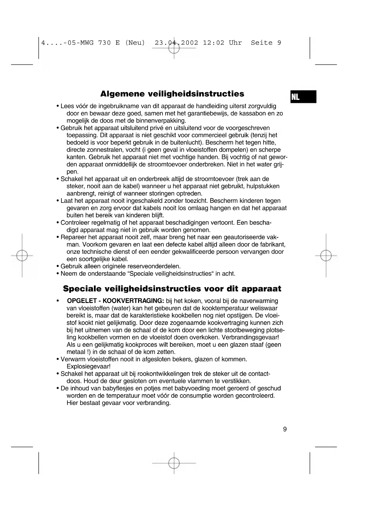 4....-05-MWG 730 E (Neu) 23.04.2002 12:02 Uhr Seite 12Het koopbewijs geldt als garantiebewijs. Zonder dit bewijs kan geen kosteloze reparatie of vervanging plaatsvinden. Geef in garantiegevallen het complete apparaat in de originele verpakking samen met de kassabon af bij uw handelaar. *) Schade aan onderdelen leidt niet automatisch tot kosteloze vervanging van het complete apparaat. Neem in dit geval contact op met onze hotline! De reparatie van glasbreuk of breuk van kunststofonderdelen wordt altijd berekend! Niet defecten aan de hulpstukken of aan de slijtende onderdelen (bijv. koolborstels, deeghaken, drijfriemen, reserveafstandsbediening, reservetandenborstels, zaag- bladen enz.), maar ook reiniging, onderhoud of de vervanging van slijtende delen vallen niet onder de garantie en geschieden altijd tegen berekening! Bij ingrepen door derden komt de garantieverlening te vervallen. Na de garantieperiode Na afloop van de garantieperiode kunnen reparaties tegen berekening worden uit- gevoerd door de betreffende vakhandelaar of de technische dienst.