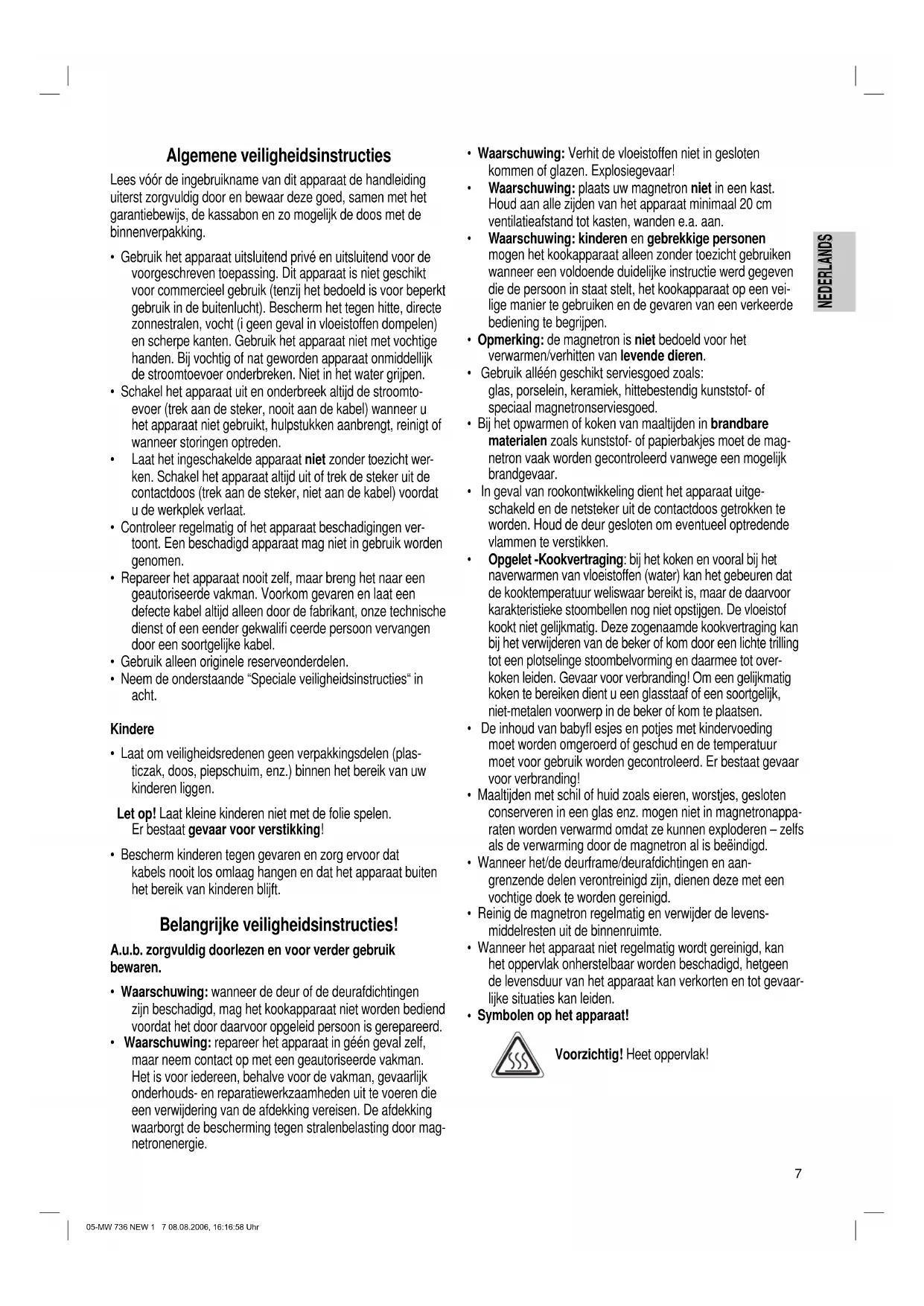 - Waarschuwing: repareer het apparaat in géén geval zelf, maar neem contact op met een geautoriseerde vakman. Het is voor iedereen, behalve voor de vakman, gevaarlijk onderhouds- en reparatiewerkzaamheden uit te voeren die een verwijdering van de afdekking vereisen. De afdekking waarborgt de bescherming tegen stralenbelasting door mag- netronenergie.