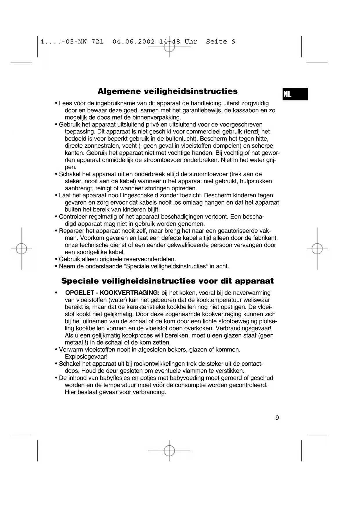 - Deurkozijn/-afdichting en naburige delen moeten, als zij vuil zijn geworden, zorgvuldig worden schoongemaakt met een vochtige doek. Dit apparaat is gekeurd conform de op dit moment van toepassing zijnde CE- richtlijnen zoals bijvoorbeeld elektromagnetische compatibiliteit en laagspannings- voorschriften en is geconstrueerd volgens de nieuwste veiligheidstechnische voor- schriften. Technische wijzigingen voorbehouden! Garantie Voor het door ons geleverde apparaat verlenen wij een garantie van 24 maanden vanaf koopdatum (kassabon). Eventuele gebreken aan het apparaat of aan het toebehoren*) die zijn ontstaan door productie- of materiaalfouten verhelpen wij binnen deze periode kosteloos door middel van reparatie of, naar ons oordeel, door vervanging. Eventuele garan- tiegevallen verlengen noch de geldigheidsduur van de garantie, noch begint daar- door een nieuwe garantieperiode! Het koopbewijs geldt als garantiebewijs. Zonder dit bewijs kan geen kosteloze reparatie of vervanging plaatsvinden. Geef in garantiegevallen het complete apparaat in de originele verpakking samen met de kassabon af bij uw handelaar. *) Schade aan onderdelen leidt niet automatisch tot kosteloze vervanging van het complete apparaat. Neem in dit geval contact op met onze hotline! De reparatie van glasbreuk of breuk van kunststofonderdelen wordt altijd berekend! Niet defecten aan de hulpstukken of aan de slijtende onderdelen (bijv. koolborstels, deeghaken, drijfriemen, reserveafstandsbediening, reservetandenborstels, zaag- bladen enz.), maar ook reiniging, onderhoud of de vervanging van slijtende delen vallen niet onder de garantie en geschieden altijd tegen berekening! Bij ingrepen door derden komt de garantieverlening te vervallen. Na de garantieperiode Na afloop van de garantieperiode kunnen reparaties tegen berekening worden uit- gevoerd door de betreffende vakhandelaar of de technische dienst. 4....-05-MW 721 04.06.2002 14:48 Uhr Seite 12Conseils généraux de sécurité