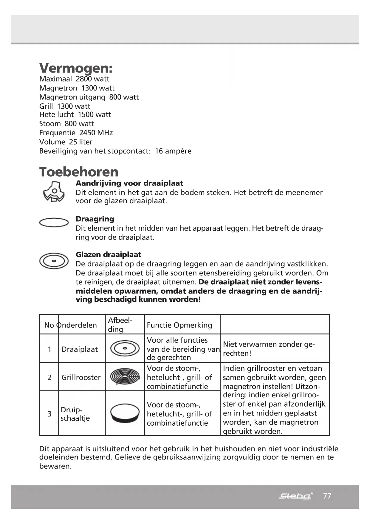 Stoomgenerator Watertank77 Vermogen: Maximaal 2800 watt Magnetron 1300 watt Magnetron uitgang 800 watt Grill 1300 watt Hete lucht 1500 watt Stoom 800 watt Frequentie 2450 MHz Volume 25 liter Beveiliging van het stopcontact: 16 ampère Toebehoren Aandrijving voor draaiplaat Dit element in het gat aan de bodem steken. Het betreft de meenemer voor de glazen draaiplaat. Draagring Dit element in het midden van het apparaat leggen. Het betreft de draag- ring voor de draaiplaat. Glazen draaiplaat De draaiplaat op de draagring leggen en aan de aandrijving vastklikken. De draaiplaat moet bij alle soorten etensbereiding gebruikt worden. Om te reinigen, de draaiplaat uitnemen. De draaiplaat niet zonder levens- middelen opwarmen, omdat anders de draagring en de aandrij- ving beschadigd kunnen worden! No Onderdelen Afbeel- ding Functie Opmerking 1 Draaiplaat Voor alle functies van de bereiding van de gerechten Niet verwarmen zonder ge- rechten! 2 Grillrooster Voor de stoom-, hetelucht-, grill- of combinatiefunctie Indien grillrooster en vetpan samen gebruikt worden, geen magnetron instellen! Uitzon- dering: indien enkel grillroo- ster of enkel pan afzonderlijk en in het midden geplaatst worden, kan de magnetron gebruikt worden.