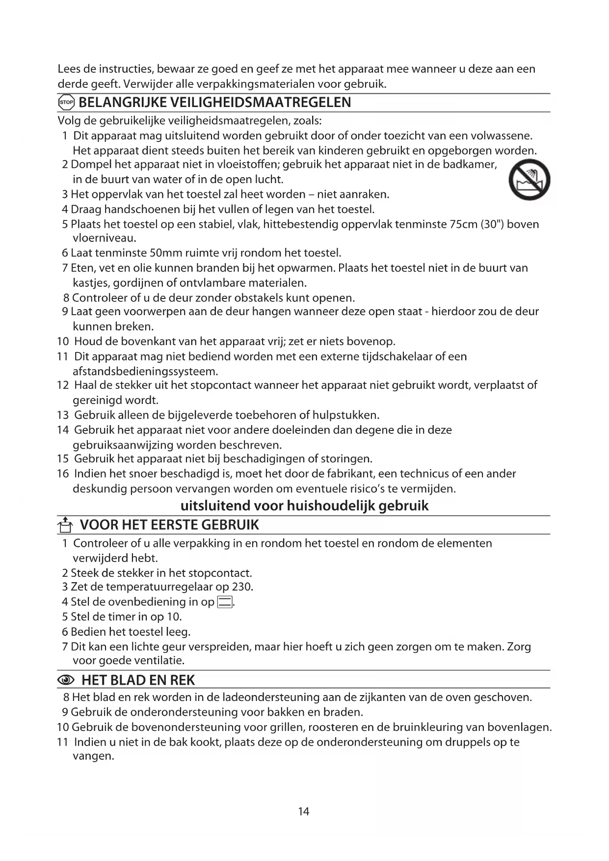 Volg de gebruikelijke veiligheidsmaatregelen, zoals: 1 Dit apparaat mag uitsluitend worden gebruikt door of onder toezicht van een volwassene. Het apparaat dient steeds buiten het bereik van kinderen gebruikt en opgeborgen worden. 2 Dompel het apparaat niet in vloeistoffen; gebruik het apparaat niet in de badkamer, in de buurt van water of in de open lucht. 3 Het oppervlak van het toestel zal heet worden – niet aanraken. 4 Draag handschoenen bij het vullen of legen van het toestel. 5 Plaats het toestel op een stabiel, vlak, hittebestendig oppervlak tenminste 75cm (30") boven vloerniveau. 6 Laat tenminste 50mm ruimte vrij rondom het toestel. 7 Eten, vet en olie kunnen branden bij het opwarmen. Plaats het toestel niet in de buurt van kastjes, gordijnen of ontvlambare materialen. 8 Controleer of u de deur zonder obstakels kunt openen. 9 Laat geen voorwerpen aan de deur hangen wanneer deze open staat - hierdoor zou de deur kunnen breken. 10 Houd de bovenkant van het apparaat vrij; zet er niets bovenop. 11 Dit apparaat mag niet bediend worden met een externe tijdschakelaar of een afstandsbedieningssysteem. 12 Haal de stekker uit het stopcontact wanneer het apparaat niet gebruikt wordt, verplaatst of gereinigd wordt. 13 Gebruik alleen de bijgeleverde toebehoren of hulpstukken. 14 Gebruik het apparaat niet voor andere doeleinden dan degene die in deze gebruiksaanwijzing worden beschreven. 15 Gebruik het apparaat niet bij beschadigingen of storingen. 16 Indien het snoer beschadigd is, moet het door de fabrikant, een technicus of een ander deskundig persoon vervangen worden om eventuele risico’s te vermijden. uitsluitend voor huishoudelijk gebruik