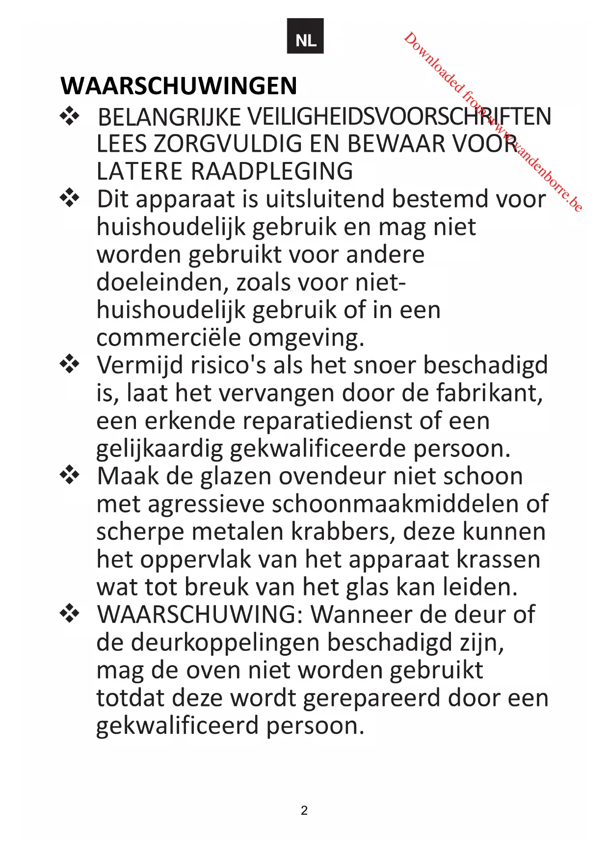eenerkendereparatiedienstofeen gelijkaardiggekwalificeerdepersoon. Maakdeglazenovendeurnietschoon metagressieveschoonmaakmiddelenof scherpemetalenkrabbers,dezekunnen hetoppervlakvanhetapparaatkrassen wattotbreukvanhetglaskanleiden. WAARSCHUWING:Wanneerdedeurof dedeurkoppelingenbeschadigdzijn, magde ovennietwordengebruikt totdatdezewordtgerepareerddooreen gekwalificeerdpersoon.