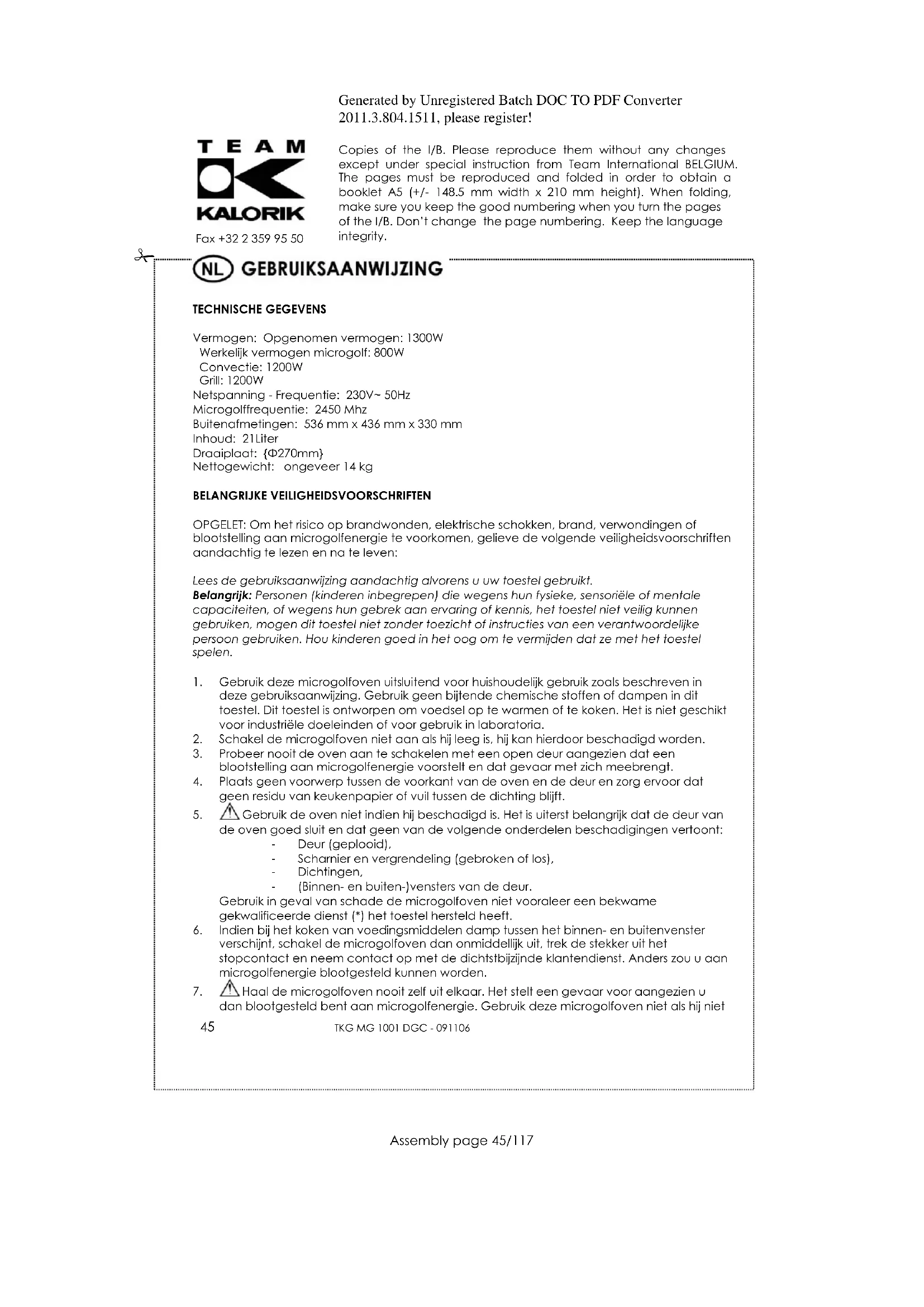 Vergrendelen: Druk tegelijkertijd op "STOP/CLEAR/CLOCK" en "START" wanneer het toestel in de aanvangspositie is. Een lange pieptoon zal luiden om aan te duiden dat de beveiliging voor kinderen geactiveerd is en “0:00” of de huidige tijd zal op het display verschijnen. Ontgrendelen: Druk tegelijkertijd op "STOP/CLEAR/CLOCK" en "START". Een lange pieptoon zal luiden om aan te duiden dat de beveiliging voor kinderen gedesactiveerd is.Generated by Unregistered Batch DOC TO PDF Converter 2011.3.804.1511, please register! Copies of the I/B. Please reproduce them without any changes except under special instruction from Team International BELGIUM. The pages must be reproduced and folded in order to obtain a booklet A5 (+/- 148.5 mm width x 210 mm height). When folding, make sure you keep the good numbering when you turn the pages of the I/B. Don‟t change the page numbering. Keep the language integrity.