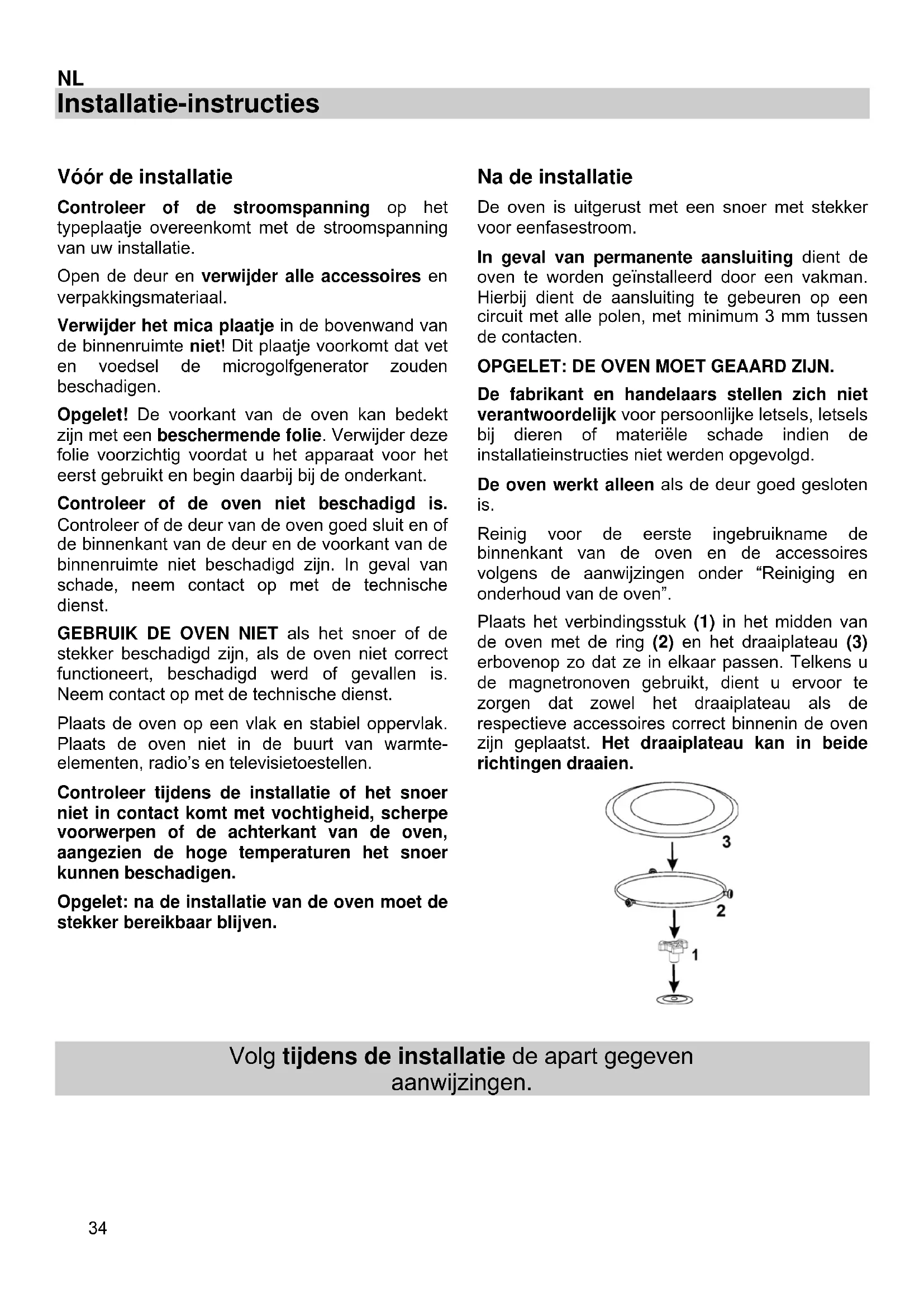 Installatie-instructies Vóór de installatie Controleer of de stroomspanning op het typeplaatje overeenkomt met de stroomspanning van uw installatie. Open de deur en verwijder alle accessoires en verpakkingsmateriaal. Verwijder het mica plaatje in de bovenwand van de binnenruimte niet! Dit plaatje voorkomt dat vet en voedsel de microgolfgenerator zouden beschadigen. Opgelet! De voorkant van de oven kan bedekt zijn met een beschermende folie. Verwijder deze folie voorzichtig voordat u het apparaat voor het eerst gebruikt en begin daarbij bij de onderkant. Controleer of de oven niet beschadigd is. Controleer of de deur van de oven goed sluit en of de binnenkant van de deur en de voorkant van de binnenruimte niet beschadigd zijn. In geval van schade, neem contact op met de technische dienst. GEBRUIK DE OVEN NIET als het snoer of de stekker beschadigd zijn, als de oven niet correct functioneert, beschadigd werd of gevallen is. Neem contact op met de technische dienst. Plaats de oven op een vlak en stabiel oppervlak. Plaats de oven niet in de buurt van warmte- elementen, radio’s en televisietoestellen. Controleer tijdens de installatie of het snoer niet in contact komt met vochtigheid, scherpe voorwerpen of de achterkant van de oven, aangezien de hoge temperaturen het snoer kunnen beschadigen. Opgelet: na de installatie van de oven moet de stekker bereikbaar blijven. Na de installatie De oven is uitgerust met een snoer met stekker voor eenfasestroom. In geval van permanente aansluiting dient de oven te worden geïnstalleerd door een vakman. Hierbij dient de aansluiting te gebeuren op een circuit met alle polen, met minimum 3 mm tussen de contacten. OPGELET: DE OVEN MOET GEAARD ZIJN. De fabrikant en handelaars stellen zich niet verantwoordelijk voor persoonlijke letsels, letsels bij dieren of materiële schade indien de installatieinstructies niet werden opgevolgd. De oven werkt alleen als de deur goed gesloten is. Reinig voor de eerste ingebruikname de binnenkant van de oven en de accessoires volgens de aanwijzingen onder “Reiniging en onderhoud van de oven”. Plaats het verbindingsstuk (1) in het midden van de oven met de ring (2) en het draaiplateau (3) erbovenop zo dat ze in elkaar passen. Telkens u de magnetronoven gebruikt, dient u ervoor te zorgen dat zowel het draaiplateau als de respectieve accessoires correct binnenin de oven zijn geplaatst. Het draaiplateau kan in beide richtingen draaien.