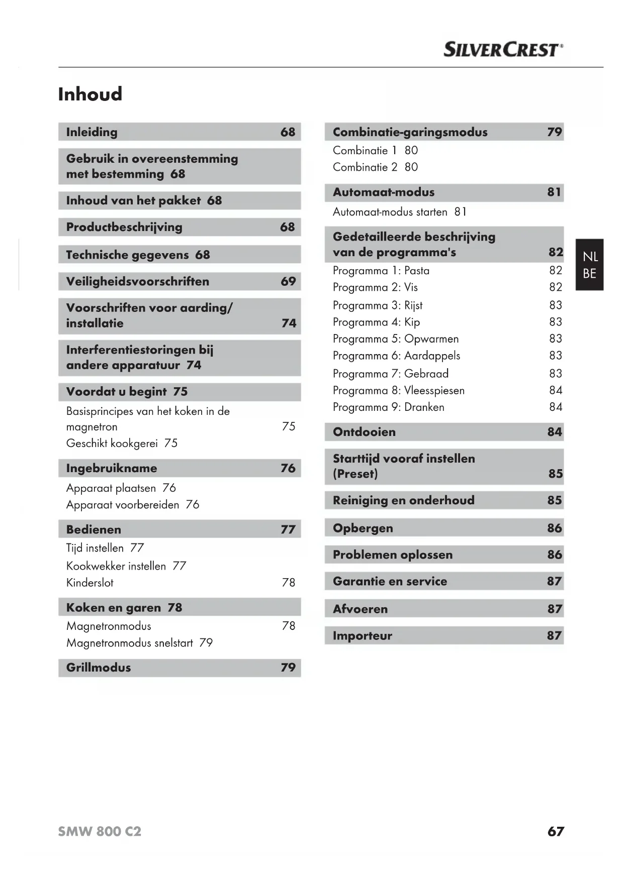 Inhoud Inleiding 68 Gebruik in overeenstemming met bestemming 68 Inhoud van het pakket 68 Productbeschrijving 68 Technische gegevens 68 Veiligheidsvoorschriften 69 Voorschriften voor aarding/ installatie 74 Interferentiestoringen bij andere apparatuur 74 Voordat u begint 75 Basisprincipes van het koken in de magnetron 75 Geschikt kookgerei 75 Ingebruikname 76 Apparaat plaatsen 76 Apparaat voorbereiden 76 Bedienen 77 Tijd instellen 77 Kookwekker instellen 77 Kinderslot 78 Koken en garen 78 Magnetronmodus 78 Magnetronmodus snelstart 79 Grillmodus 79 Combinatie-garingsmodus 79 Combinatie 1 80 Combinatie 2 80 Automaat-modus 81 Automaat-modus starten 81 Gedetailleerde beschrijving van de programma's 82 Programma 1: Pasta 82 Programma 2: Vis 82 Programma 3: Rijst 83 Programma 4: Kip 83 Programma 5: Opwarmen 83 Programma 6: Aardappels 83 Programma 7: Gebraad 83 Programma 8: Vleesspiesen 84 Programma 9: Dranken 84 Ontdooien 84 Starttijd vooraf instellen (Preset) 85 Reiniging en onderhoud 85 Opbergen 86 Problemen oplossen 86 Garantie en service 87 Afvoeren 87 Importeur 8768 SMW 800 C2