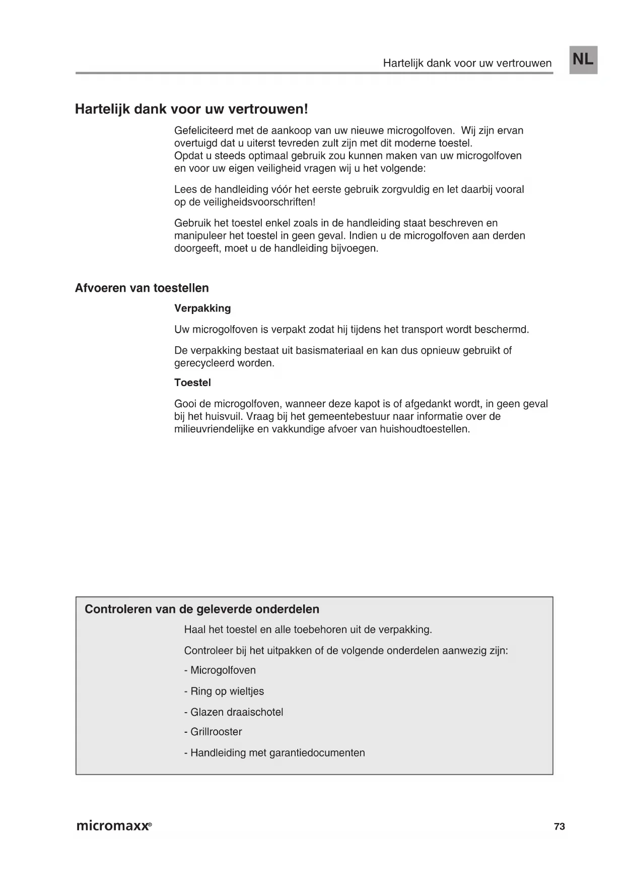 Opdat u steeds optimaal gebruik zou kuren makev van uw microgolfoven en voor uw eigengeigheid vragen wij u het volgende: