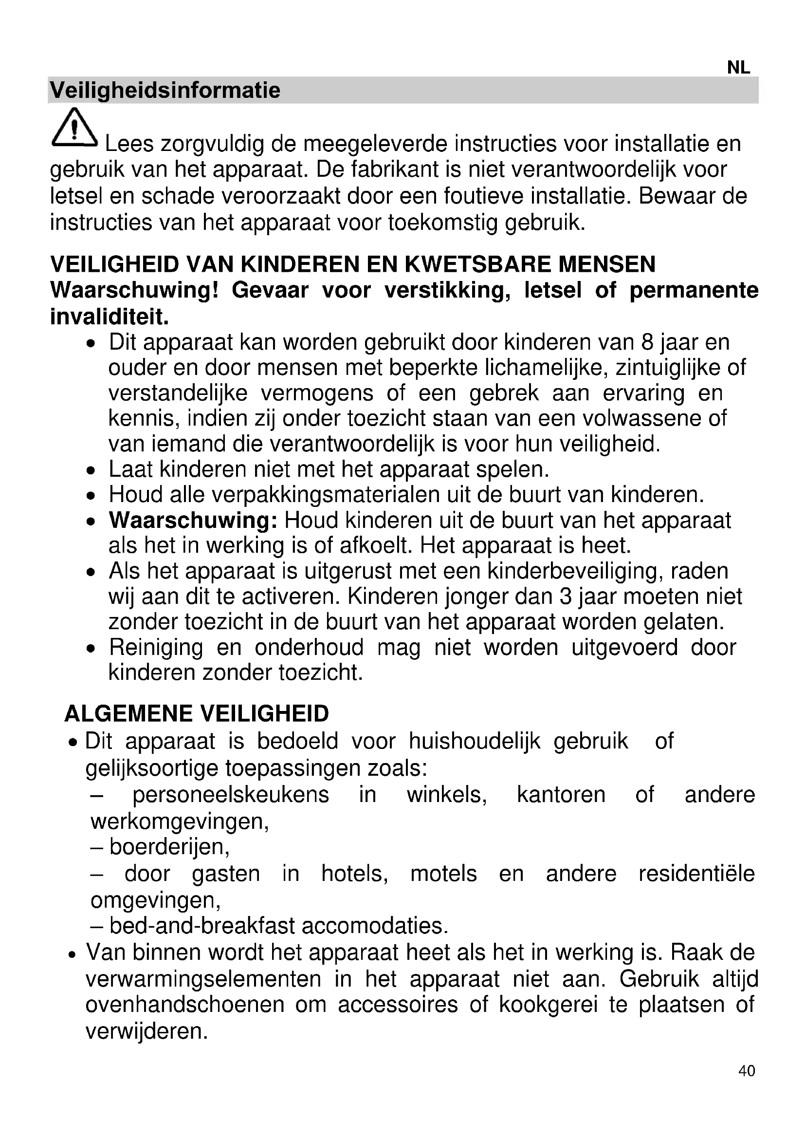 Waarschuwing! Gevaar voor verstikking, letsel of permanente invaliditeit. Dit apparaat kan worden gebruikt door kinderen van 8 jaar en ouder en door mensen met beperkte lichamelijke, zintuiglijke of verstandelijke vermogens of een gebrek aan ervaring en kennis, indien zij onder toezicht staan van een volwassene of van iemand die verantwoordelijk is voor hun veiligheid. Laat kinderen niet met het apparaat spelen. Houd alle verpakkingsmaterialen uit de buurt van kinderen. Waarschuwing: Houd kinderen uit de buurt van het apparaat als het in werking is of afkoelt. Het apparaat is heet. Als het apparaat is uitgerust met een kinderbeveiliging, raden wij aan dit te activeren. Kinderen jonger dan 3 jaar moeten niet zonder toezicht in de buurt van het apparaat worden gelaten. Reiniging en onderhoud mag niet worden uitgevoerd door kinderen zonder toezicht. ALGEMENE VEILIGHEID Dit apparaat is bedoeld voor huishoudelijk gebruik of gelijksoortige toepassingen zoals: – personeelskeukens in winkels, kantoren of andere werkomgevingen, – boerderijen, – door gasten in hotels, motels en andere residentiële omgevingen, – bed-and-breakfast accomodaties. Van binnen wordt het apparaat heet als het in werking is. Raak de verwarmingselementen in het apparaat niet aan. Gebruik altijd ovenhandschoenen om accessoires of kookgerei te plaatsen of verwijderen.41