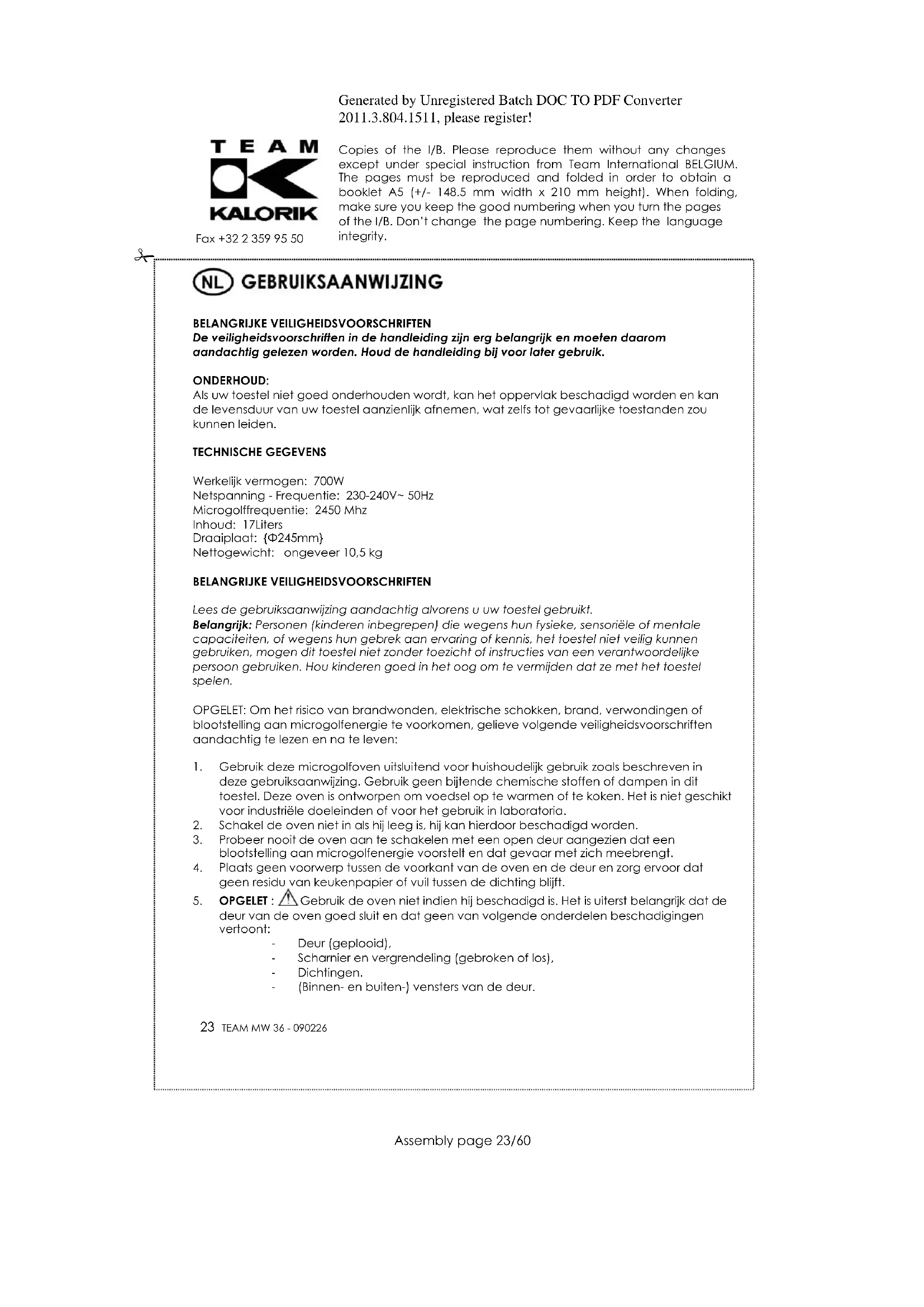 GEBRUIKSAANWIJZING MW 36 TEAM