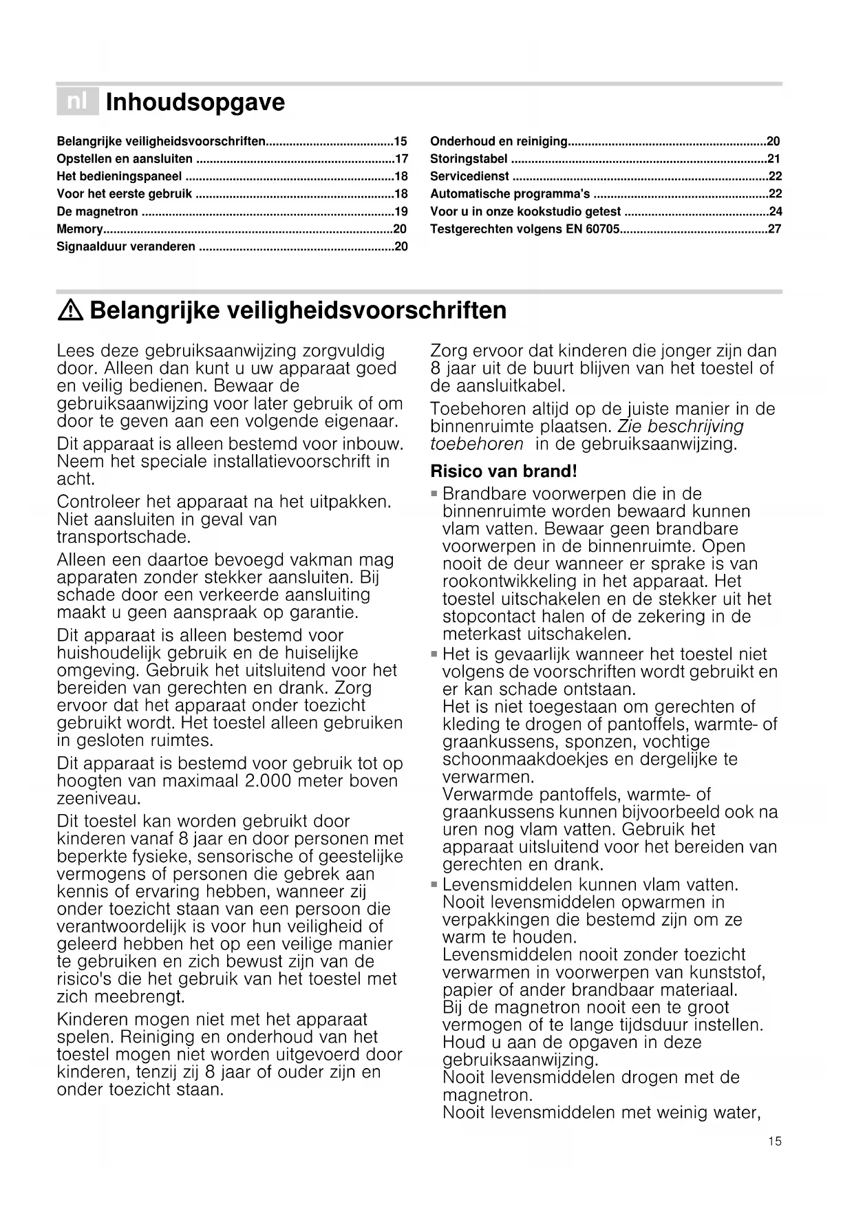 Levensmiddelen kunnen vlam vatten. Nooit levensmiddelen opwarmen in verpakkingen die bestemd zijn om ze warm te houden. Levensmiddelen nooit zonder toezicht verwarmen in voorwerpen van kunststof, papier of ander brandbaar materiaal. Bij de magnetron nooit een te groot vermogen of te lange tijdsduur instellen. Houd u aan de opgaven in deze gebruiksaanwijzing. Nooit levensmiddelen drogen met de magnetron. Nooit levensmiddelen met weinig water,16 zoals bijv. brood, met een te hoog magnetronvermogen of te lange -tijd ontdooien of verwarmen. Risico van brand!