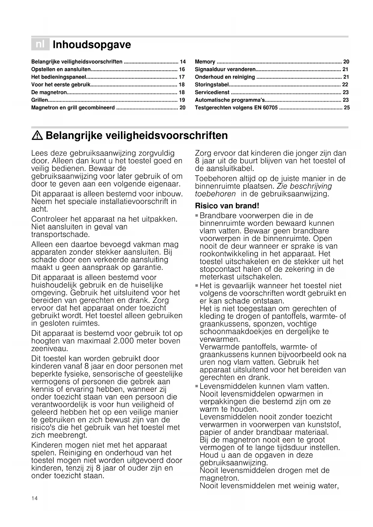 - Testgerechten volgens EN 60705 : Belangrijke veiligheidsvoorschriften Lees deze gebruiksaanwijzing zorgvuldig door. Alleen dan kunt u het toestel goed en veilig bedienen. Bewaar de gebruiksaanwijzing voor later gebruik of om door te geven aan een volgende eigenaar. Dit apparaat is alleen bestemd voor inbouw. Neem het speciale installatievoorschrift in acht. Controleer het apparaat na het uitpakken. Niet aansluiten in geval van transportschade. Alleen een daartoe bevoegd vakman mag apparaten zonder stekker aansluiten. Bij schade door een verkeerde aansluiting maakt u geen aanspraak op garantie. Dit apparaat is alleen bestemd voor huishoudelijk gebruik en de huiselijke omgeving. Gebruik het uitsluitend voor het bereiden van gerechten en drank. Zorg ervoor dat het apparaat onder toezicht gebruikt wordt. Het toestel alleen gebruiken in gesloten ruimtes. Dit apparaat is bestemd voor gebruik tot op hoogten van maximaal 2.000 meter boven zeeniveau. Dit toestel kan worden gebruikt door kinderen vanaf 8 jaar en door personen met beperkte fysieke, sensorische of geestelijke vermogens of personen die gebrek aan kennis of ervaring hebben, wanneer zij onder toezicht staan van een persoon die verantwoordelijk is voor hun veiligheid of geleerd hebben het op een veilige manier te gebruiken en zich bewust zijn van de risico's die het gebruik van het toestel met zich meebrengt. Kinderen mogen niet met het apparaat spelen. Reiniging en onderhoud van het toestel mogen niet worden uitgevoerd door kinderen, tenzij zij 8 jaar of ouder zijn en onder toezicht staan. Zorg ervoor dat kinderen die jonger zijn dan 8 jaar uit de buurt blijven van het toestel of de aansluitkabel. Toebehoren altijd op de juiste manier in de binnenruimte plaatsen. Zie beschrijving toebehoren in de gebruiksaanwijzing. Risico van brand! p. 25