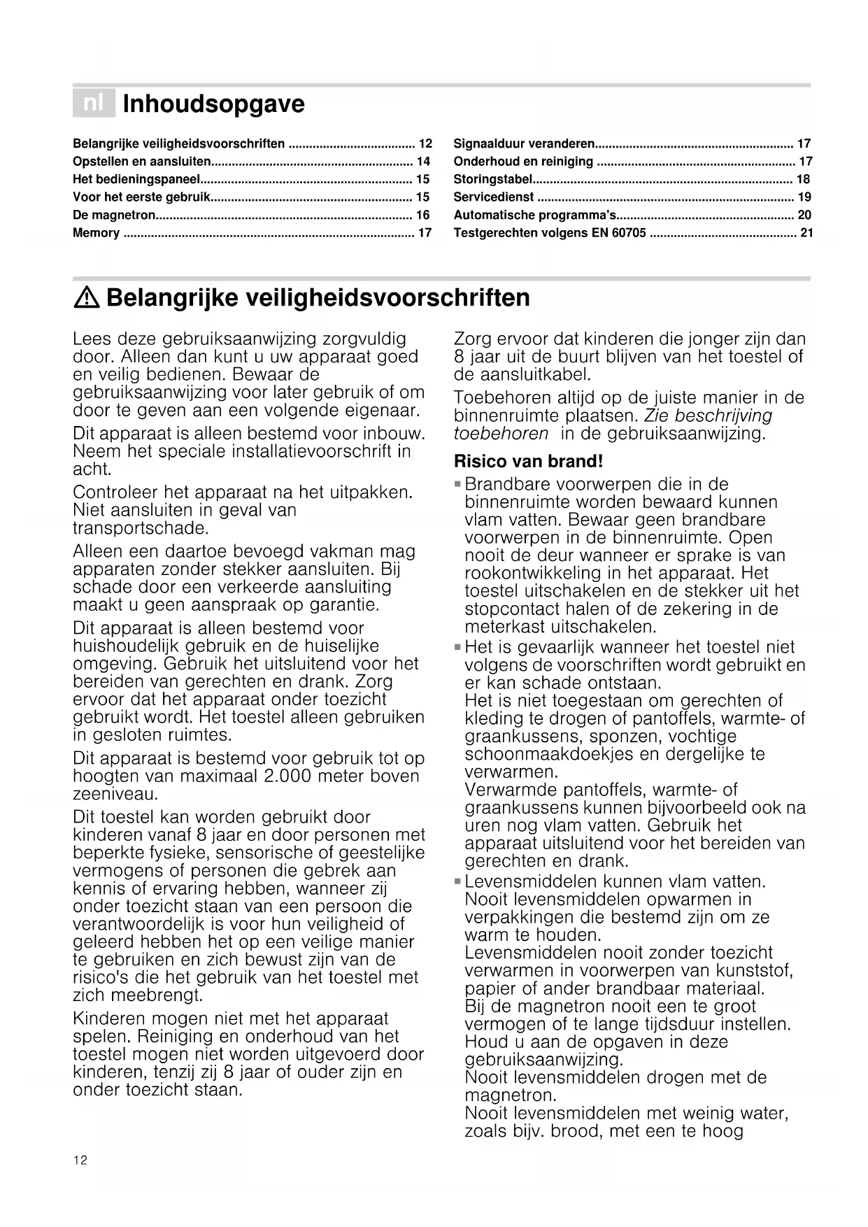 - Testgerechten volgens EN 60705 : Belangrijke veiligheidsvoorschriften Lees deze gebruiksaanwijzing zorgvuldig door. Alleen dan kunt u uw apparaat goed en veilig bedienen. Bewaar de gebruiksaanwijzing voor later gebruik of om door te geven aan een volgende eigenaar. Dit apparaat is alleen bestemd voor inbouw. Neem het speciale installatievoorschrift in acht. Controleer het apparaat na het uitpakken. Niet aansluiten in geval van transportschade. Alleen een daartoe bevoegd vakman mag apparaten zonder stekker aansluiten. Bij schade door een verkeerde aansluiting maakt u geen aanspraak op garantie. Dit apparaat is alleen bestemd voor huishoudelijk gebruik en de huiselijke omgeving. Gebruik het uitsluitend voor het bereiden van gerechten en drank. Zorg ervoor dat het apparaat onder toezicht gebruikt wordt. Het toestel alleen gebruiken in gesloten ruimtes. Dit apparaat is bestemd voor gebruik tot op hoogten van maximaal 2.000 meter boven zeeniveau. Dit toestel kan worden gebruikt door kinderen vanaf 8 jaar en door personen met beperkte fysieke, sensorische of geestelijke vermogens of personen die gebrek aan kennis of ervaring hebben, wanneer zij onder toezicht staan van een persoon die verantwoordelijk is voor hun veiligheid of geleerd hebben het op een veilige manier te gebruiken en zich bewust zijn van de risico's die het gebruik van het toestel met zich meebrengt. Kinderen mogen niet met het apparaat spelen. Reiniging en onderhoud van het toestel mogen niet worden uitgevoerd door kinderen, tenzij zij 8 jaar of ouder zijn en onder toezicht staan. Zorg ervoor dat kinderen die jonger zijn dan 8 jaar uit de buurt blijven van het toestel of de aansluitkabel. Toebehoren altijd op de juiste manier in de binnenruimte plaatsen. Zie beschrijving toebehoren in de gebruiksaanwijzing. Risico van brand! p. 21