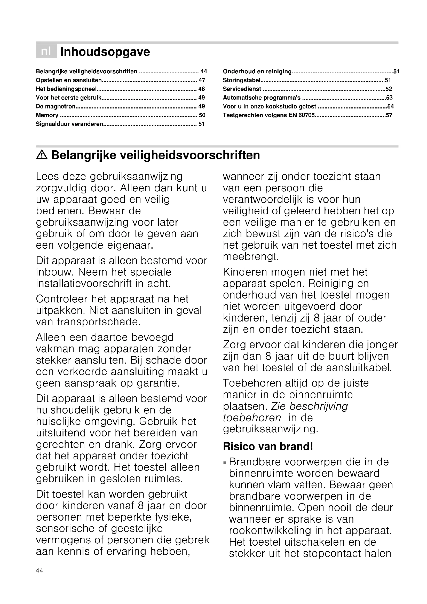 Brandbare voorwerpen die in de binnenruimte worden bewaard kunnen vlam vatten. Bewaar geen brandbare voorwerpen in de binnenruimte. Open nooit de deur wanneer er sprake is van rookontwikkeling in het apparaat. Het toestel uitschakelen en de stekker uit het stopcontact halen45 of de zekering in de meterkast uitschakelen. Risico van brand!