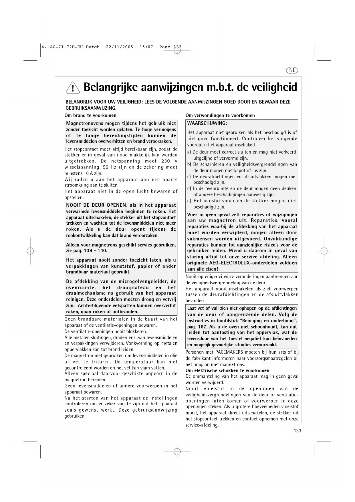 4. AG-71+72D-EU Dutch 22/11/2005 15:07 Page 133Belangrijke aanwijzingen m.b.t. de veiligheid