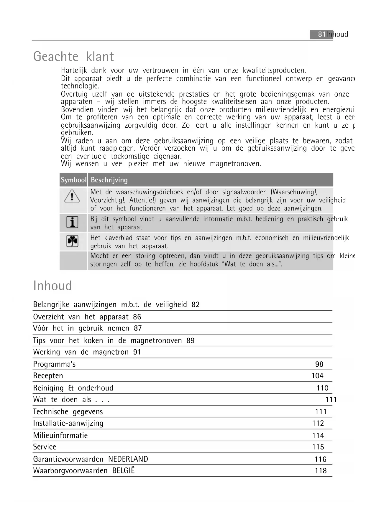 Tél. : 08 92 68 24 33 (0,34 e TTC/mn) E-MAIL :ehp.consommateur@electrolux.fr Permanence téléphonique du lundi au vendredi Dans le souci d’une amélioration constante de nos produits, nous nous réservons le droit d’apporter à leurs caractéristiques toutes modifications liées à l’évolution technique (décret du 24.03.78). Electrolux Home Products France S.A.S. au capital de 67 500 000 € - 562 076 125 RCS COMPIEGNE81Inhoud Hartelijk dank voor uw vertrouwen in één van onze kwaliteitsproducten. Dit apparaat biedt u de perfecte combinatie van een functioneel ontwerp en geavanceerde technologie. Overtuig uzelf van de uitstekende prestaties en het grote bedieningsgemak van onze apparaten – wij stellen immers de hoogste kwaliteitseisen aan onze producten. Bovendien vinden wij het belangrijk dat onze producten milieuvriendelijk en energiezuinig zijn. Om te profiteren van een optimale en correcte werking van uw apparaat, leest u eerst deze gebruiksaanwijzing zorgvuldig door. Zo leert u alle instellingen kennen en kunt u ze perfect gebruiken. Wij raden u aan om deze gebruiksaanwijzing op een veilige plaats te bewaren, zodat u deze altijd kunt raadplegen. Verder verzoeken wij u om de gebruiksaanwijzing door te geven aan een eventuele toekomstige eigenaar. Wij wensen u veel plezier met uw nieuwe magnetronoven. Geachte klant Symbool Beschrijving Met de waarschuwingsdriehoek en/of door signaalwoorden (Waarschuwing!, Voorzichtig!, Attentie!) geven wij aanwijzingen die belangrijk zijn voor uw veiligheid of voor het functioneren van het apparaat. Let goed op deze aanwijzingen. Bij dit symbool vindt u aanvullende informatie m.b.t. bediening en praktisch gebruik van het apparaat. Het klaverblad staat voor tips en aanwijzingen m.b.t. economisch en milieuvriendelijk gebruik van het apparaat. Mocht er een storing optreden, dan vindt u in deze gebruiksaanwijzing tips om kleine storingen zelf op te heffen, zie hoofdstuk “Wat te doen als...”. Inhoud Belangrijke aanwijzingen m.b.t. de veiligheid 82 Overzicht van het apparaat 86 Vóór het in gebruik nemen 87 Tips voor het koken in de magnetronoven 89 Werking van de magnetron 91 Programma’s 98 Recepten 104 Reiniging & onderhoud 110 Wat te doen als . . . 111 Technische gegevens 111 Installatie-aanwijzing 112 Milieuinformatie 114 Service 115 Garantievoorwaarden NEDERLAND 116 Waarborgvoorwaarden BELGIË 11882 Belangrijke aanwijzingen m.b.t. de veiligheid BELANGRIJK VOOR UW VEILIGHEID: LEES DE VOLGENDE