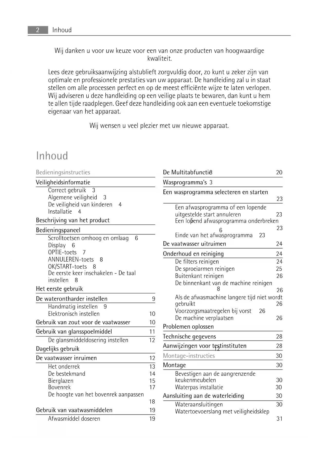 InhoudAansluiting waterafvoerslang 31 Aansluiting aan het elektriciteitsnet 33 Milieubescherming 33 Verpakkingsmateriaal 33 Wijzigingen voorbehouden Bedieningsinstructies Veiligheidsinformatie In het belang van uw veiligheid en om een correct gebruik te kunnen waarborgen is het van belang dat u, alvorens het apparaat te installeren en in gebruik te nemen, deze ge- bruiksaanwijzing, inclusief de tips en waarschuwingen, grondig doorleest. Om onnodige vergissingen en ongevallen te voorkomen is het belangrijk te waarborgen dat alle mensen die het apparaat gebruiken, volledig bekend zijn met de werking ervan en de veiligheids- voorzieningen. Bewaar deze instructies en zorg ervoor dat zij bij het apparaat blijven als het wordt verplaatst of verkocht, zodat iedereen die het apparaat gedurende zijn hele levensduur gebruikt, naar behoren is geïnformeerd over het gebruik en de veiligheid van het apparaat. Correct gebruik