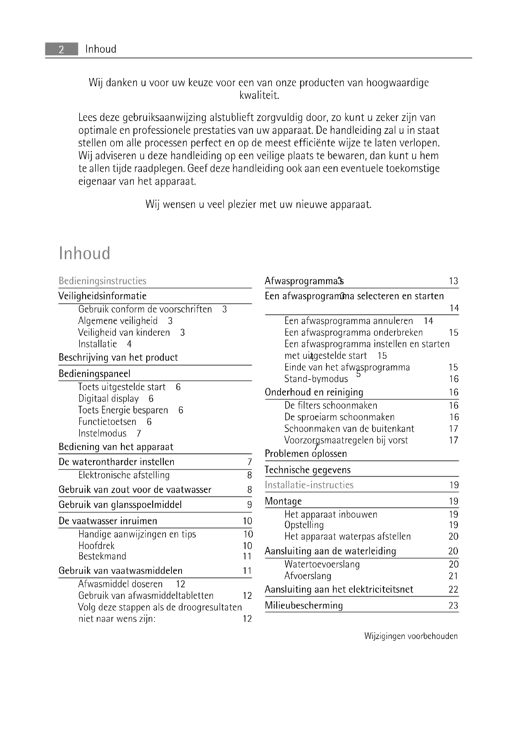 Een afwasprogramma annuleren 14 Een afwasprogramma onderbreken 15 Een afwasprogramma instellen en starten met uitgestelde start 15 Einde van het afwasprogramma 15 Stand-bymodus 16 Onderhoud en reiniging 16 De filters schoonmaken 16 De sproeiarm schoonmaken 16 Schoonmaken van de buitenkant 17 Voorzorgsmaatregelen bij vorst 17 Problemen oplossen 17 Technische gegevens 19 Installatie-instructies 19 Montage 19 Het apparaat inbouwen 19 Opstelling 19 Het apparaat waterpas afstellen 20 Aansluiting aan de waterleiding 20 Watertoevoerslang 20 Afvoerslang 21 Aansluiting aan het elektriciteitsnet 22 Milieubescherming 23 Wijzigingen voorbehouden