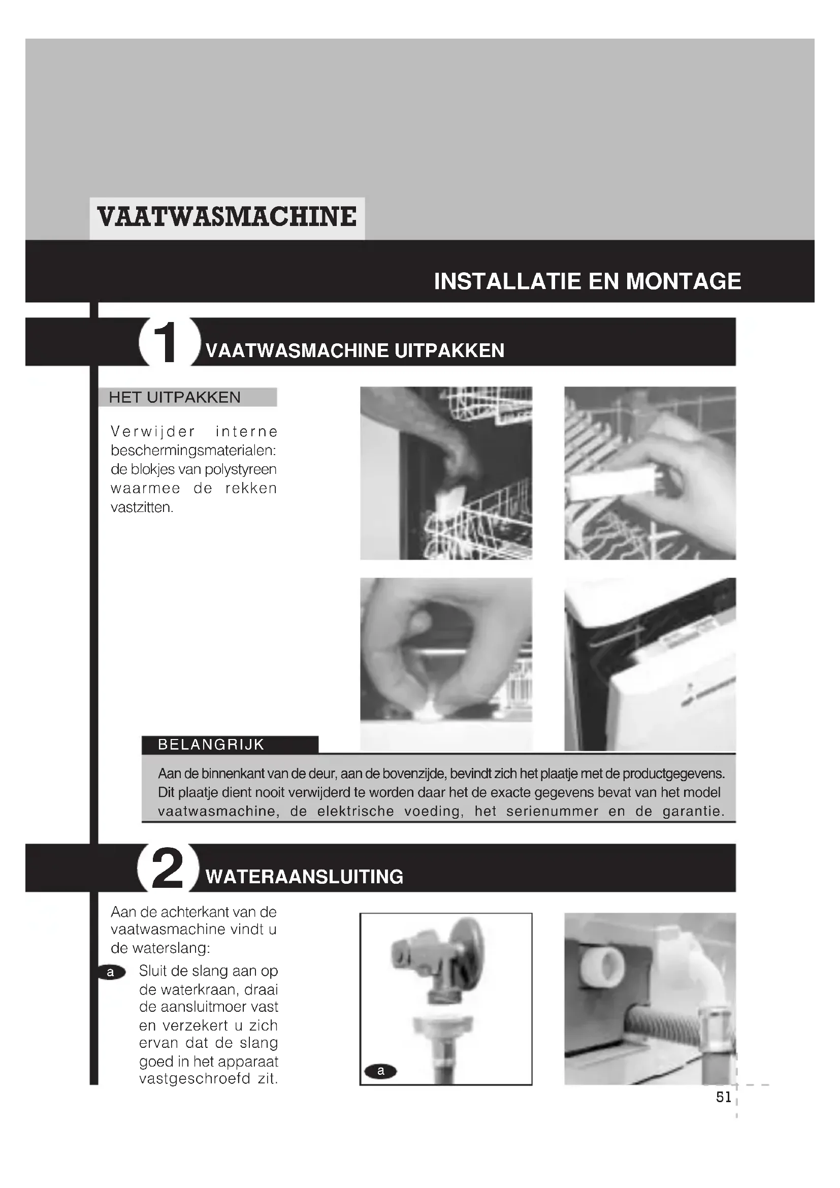 VAATWASMACHINE UITPAKKEN Verwijder interne beschermingsmaterialen: de blokjes van polystyreen waarmee de rekken vastzitten. Aan de binnenkant van de deur, aan de bovenzijde, bevindt zich het plaatje met de productgegevens.Dit plaatje dient nooit verwijderd te worden daar het de exacte gegevens bevat van het modelvaatwasmachine, de elektrische voeding, het serienummer en de garantie.BELANGRIJK