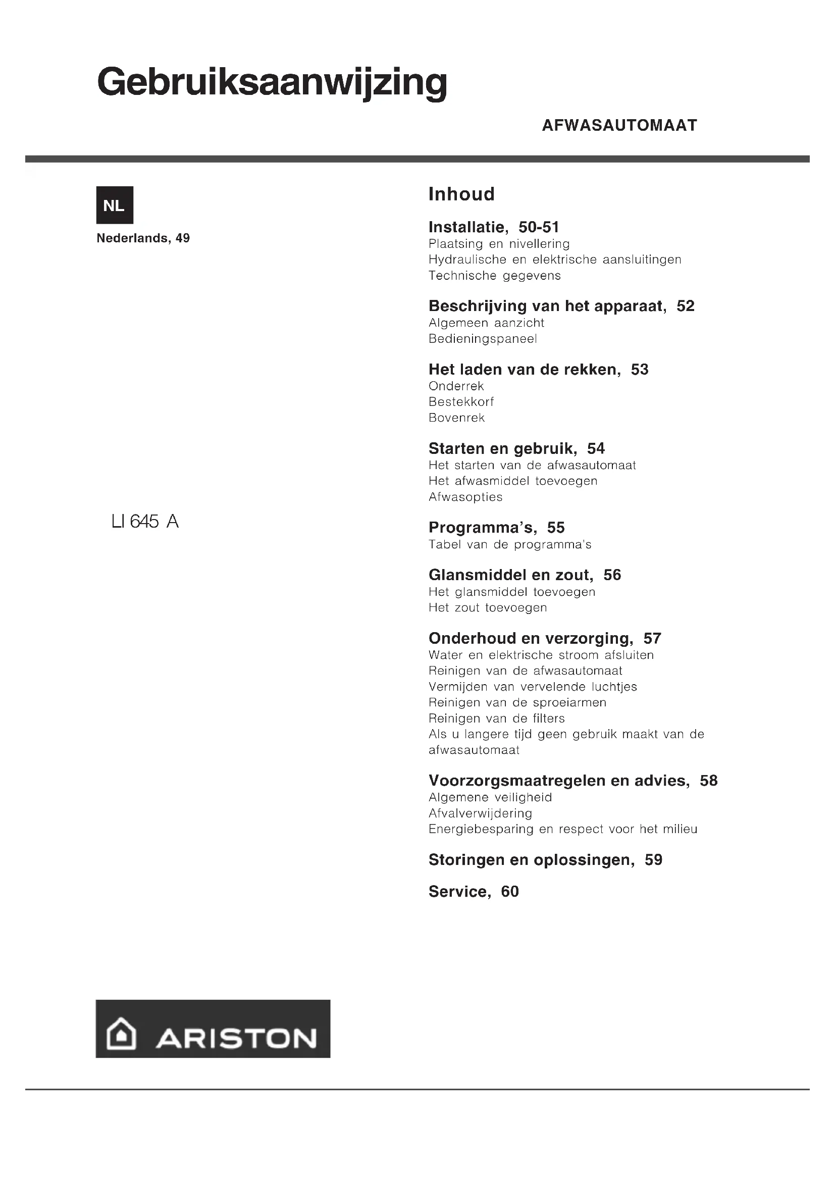 LI645A - Vaatwassers Ariston Thermo - Gratis gebruiksaanwijzing en handleiding