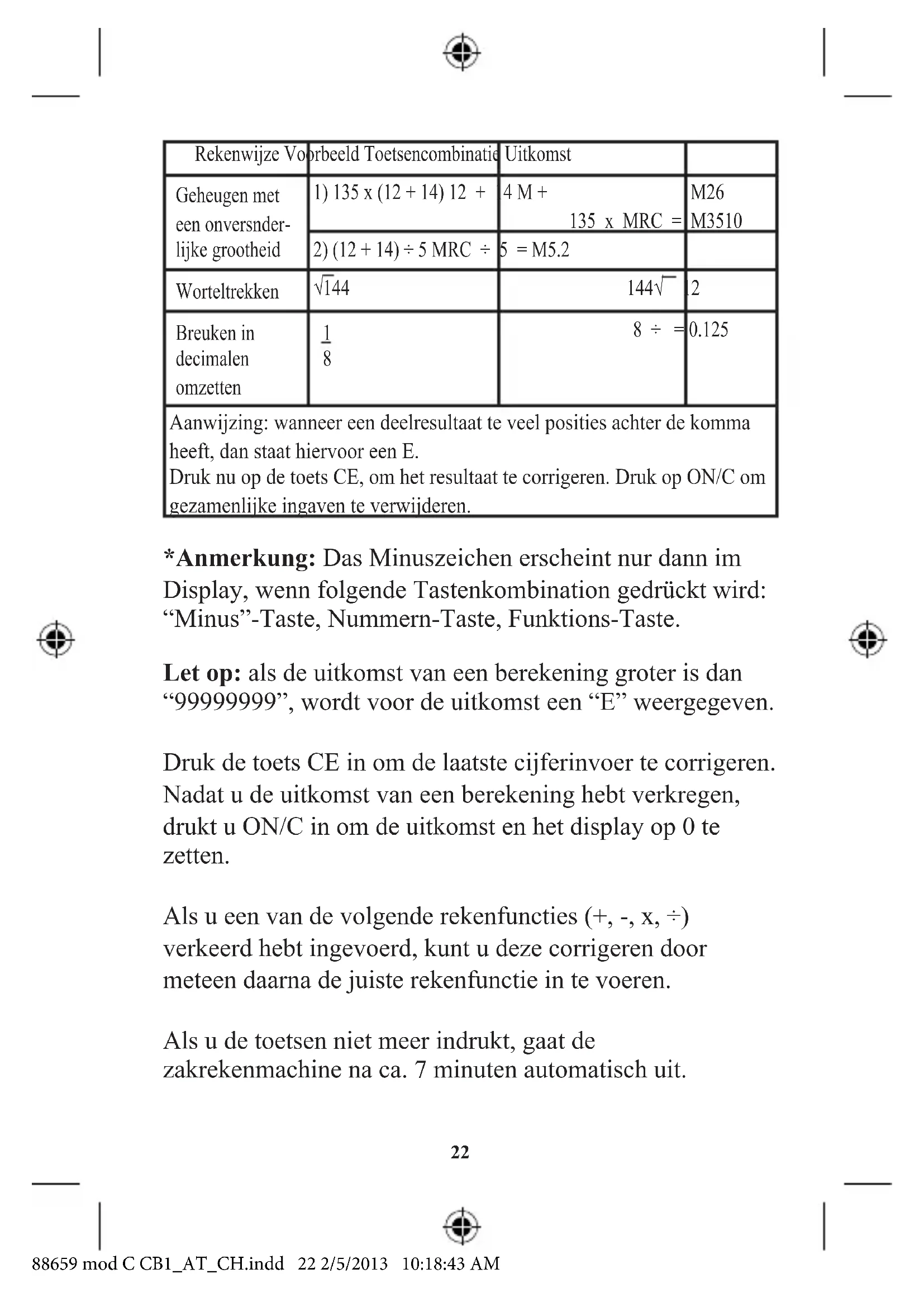 8 ÷ = 0.125 Aanwijzing: wanneer een deelresultaat te veel posities achter de komma heeft, dan staat hiervoor een E. Druk nu op de toets CE, om het resultaat te corrigeren. Druk op ON/C om gezamenlijke ingaven te verwijderen. *Anmerkung: Das Minuszeichen erscheint nur dann im Display, wenn folgende Tastenkombination gedrückt wird: “Minus”-Taste, Nummern-Taste, Funktions-Taste. Let op: als de uitkomst van een berekening groter is dan “99999999”, wordt voor de uitkomst een “E” weergegeven. Druk de toets CE in om de laatste cijferinvoer te corrigeren. Nadat u de uitkomst van een berekening hebt verkregen, drukt u ON/C in om de uitkomst en het display op 0 te zetten. Als u een van de volgende rekenfuncties (+, -, x, ÷) verkeerd hebt ingevoerd, kunt u deze corrigeren door meteen daarna de juiste rekenfunctie in te voeren. Als u de toetsen niet meer indrukt, gaat de zakrekenmachine na ca. 7 minuten automatisch uit. 144√ √144 88659 mod C CB1_AT_CH.indd 22 2/5/2013 10:18:43 AM23 Probleemoplossing Als het display niet functioneert, ga dan als volgt te werk: