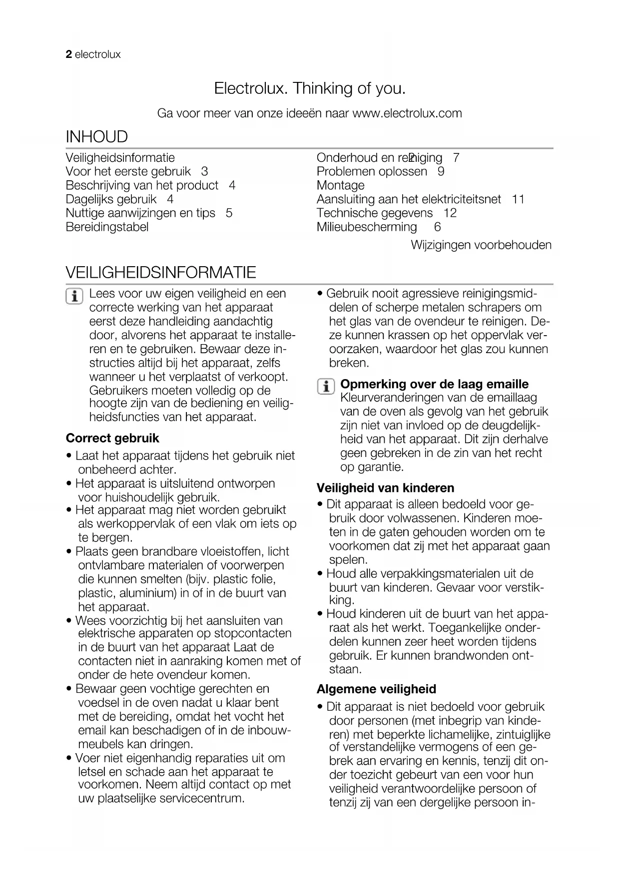 gebruiksaanwijzing user manual notice d'utilisation benutzerinformation kullanma kılavuzu Inbouwoven Built-in oven Four encastrable Elektro-Einbaubackofen Ankastre Fırın EOB31004Electrolux. Thinking of you. Ga voor meer van onze ideeën naar www.electrolux.com INHOUD Veiligheidsinformatie 2 Voor het eerste gebruik 3 Beschrijving van het product 4 Dagelijks gebruik 4 Nuttige aanwijzingen en tips 5 Bereidingstabel 6 Onderhoud en reiniging 7 Problemen oplossen 9 Montage 10 Aansluiting aan het elektriciteitsnet 11 Technische gegevens 12 Milieubescherming 12 Wijzigingen voorbehouden VEILIGHEIDSINFORMATIE Lees voor uw eigen veiligheid en een correcte werking van het apparaat eerst deze handleiding aandachtig door, alvorens het apparaat te installe- ren en te gebruiken. Bewaar deze in- structies altijd bij het apparaat, zelfs wanneer u het verplaatst of verkoopt. Gebruikers moeten volledig op de hoogte zijn van de bediening en veilig- heidsfuncties van het apparaat. Correct gebruik