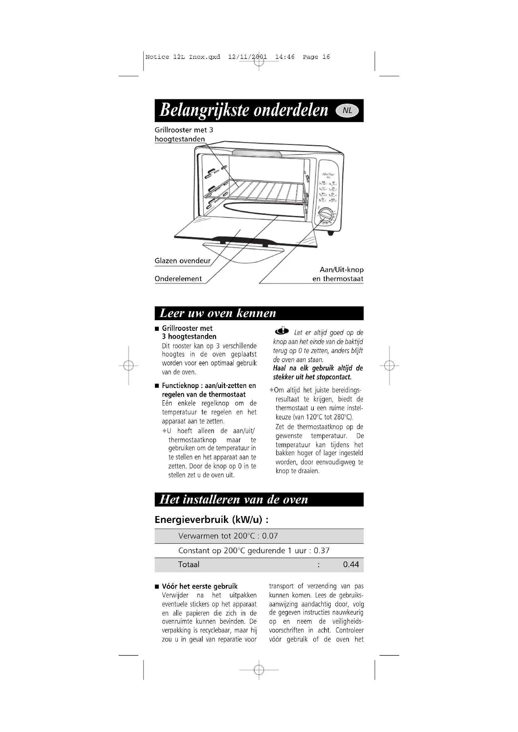 Vóór het eerste gebruik Verwijder na het uitpakken eventuele stickers op het apparaat en alle papieren die zich in de ovenruimte kunnen bevinden. De verpakking is recyclebaar, maar hij zou u in geval van reparatie voor transport of verzending van pas kunnen komen. Lees de gebruiks- aanwijzing aandachtig door, volg de gegeven instructies nauwkeurig op en neem de veiligheids- voorschriften in acht. Controleer vóór gebruik of de oven het Onderelement Aan/Uit-knop en thermostaat Glazen ovendeur Grillrooster met 3 hoogtestanden