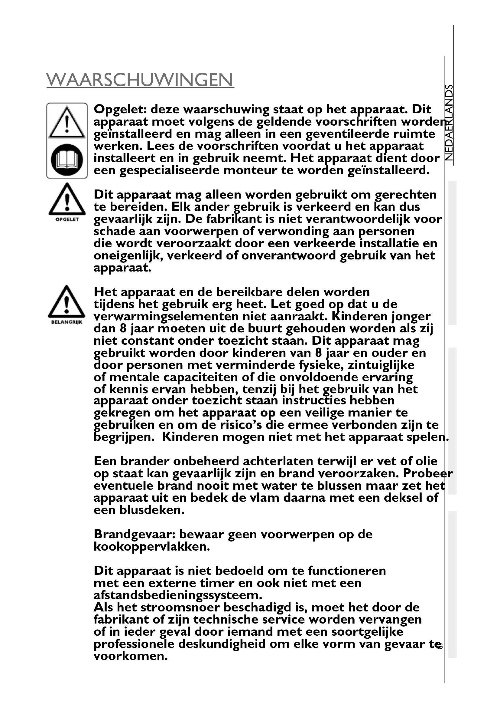 NEDAERLANDS WAARSCHUWINGEN Opgelet: deze waarschuwing staat op het apparaat. Dit apparaat moet volgens de geldende voorschriften worden geïnstalleerd en mag alleen in een geventileerde ruimte werken. Lees de voorschriften voordat u het apparaat installeert en in gebruik neemt. Het apparaat dient door een gespecialiseerde monteur te worden geïnstalleerd. Dit apparaat mag alleen worden gebruikt om gerechten te bereiden. Elk ander gebruik is verkeerd en kan dus gevaarlijk zijn. De fabrikant is niet verantwoordelijk voor schade aan voorwerpen of verwonding aan personen die wordt veroorzaakt door een verkeerde installatie en oneigenlijk, verkeerd of onverantwoord gebruik van het apparaat. Het apparaat en de bereikbare delen worden tijdens het gebruik erg heet. Let goed op dat u de verwarmingselementen niet aanraakt. Kinderen jonger dan 8 jaar moeten uit de buurt gehouden worden als zij niet constant onder toezicht staan. Dit apparaat mag gebruikt worden door kinderen van 8 jaar en ouder en door personen met verminderde fysieke, zintuiglijke of mentale capaciteiten of die onvoldoende ervaring of kennis ervan hebben, tenzij bij het gebruik van het apparaat onder toezicht staan instructies hebben gekregen om het apparaat op een veilige manier te gebruiken en om de risico’s die ermee verbonden zijn te begrijpen. Kinderen mogen niet met het apparaat spelen. Een brander onbeheerd achterlaten terwijl er vet of olie op staat kan gevaarlijk zijn en brand veroorzaken. Probeer eventuele brand nooit met water te blussen maar zet het apparaat uit en bedek de vlam daarna met een deksel of een blusdeken. Brandgevaar: bewaar geen voorwerpen op de kookoppervlakken. Dit apparaat is niet bedoeld om te functioneren met een externe timer en ook niet met een afstandsbedieningssysteem. Als het stroomsnoer beschadigd is, moet het door de fabrikant of zijn technische service worden vervangen of in ieder geval door iemand met een soortgelijke professionele deskundigheid om elke vorm van gevaar te voorkomen.ONDERHOUD GEBRUIKINSTALLATIE