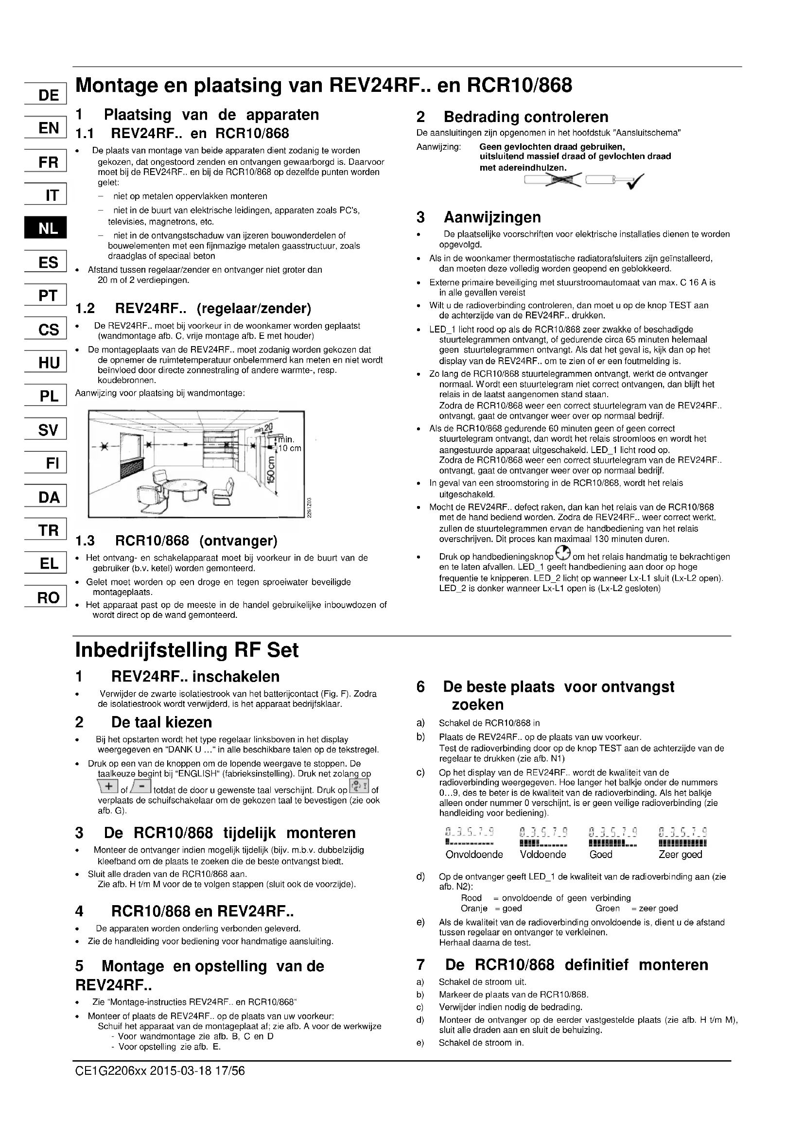 - Zie “Montage-instructies REV24RF.. en RCR10/868“· Monteer of plaats de REV24RF.. op de plaats van uw voorkeur:Schuif het apparaat van de montageplaat af; zie afb. A voor de werkwijze - Voor wandmontage zie afb. B, C en D - Voor opstelling zie afb. E. 6 De beste plaats voor ontvangst zoeken a) Schakel de RCR10/868 in b) Plaats de REV24RF.. op de plaats van uw voorkeur. Test de radioverbinding door op de knop TEST aan de achterzijde van deregelaar te drukken (zie afb. N1) c) Op het display van de REV24RF.. wordt de kwaliteit van de radioverbinding weergegeven. Hoe langer het balkje onder de nummers0…9, des te beter is de kwaliteit van de radioverbinding. Als het balkjealleen onder nummer 0 verschijnt, is er geen veilige radioverbinding (ziehandleiding voor bediening). Onvoldoende Voldoende Goed Zeer goed d) Op de ontvanger geeft LED_1 de kwaliteit van de radioverbinding aan (zie afb. N2):Rood = onvoldoende of geen verbinding Oranje = goed Groen = zeer goed e) Als de kwaliteit van de radioverbinding onvoldoende is, dient u de afstand tussen regelaar en ontvanger te verkleinen.Herhaal daarna de test. 7 De RCR10/868 definitief monteren a) Schakel de stroom uit. b) Markeer de plaats van de RCR10/868. c) Verwijder indien nodig de bedrading. d) Monteer de ontvanger op de eerder vastgestelde plaats (zie afb. H t/m M),sluit alle draden aan en sluit de behuizing. e) Schakel de stroom in.