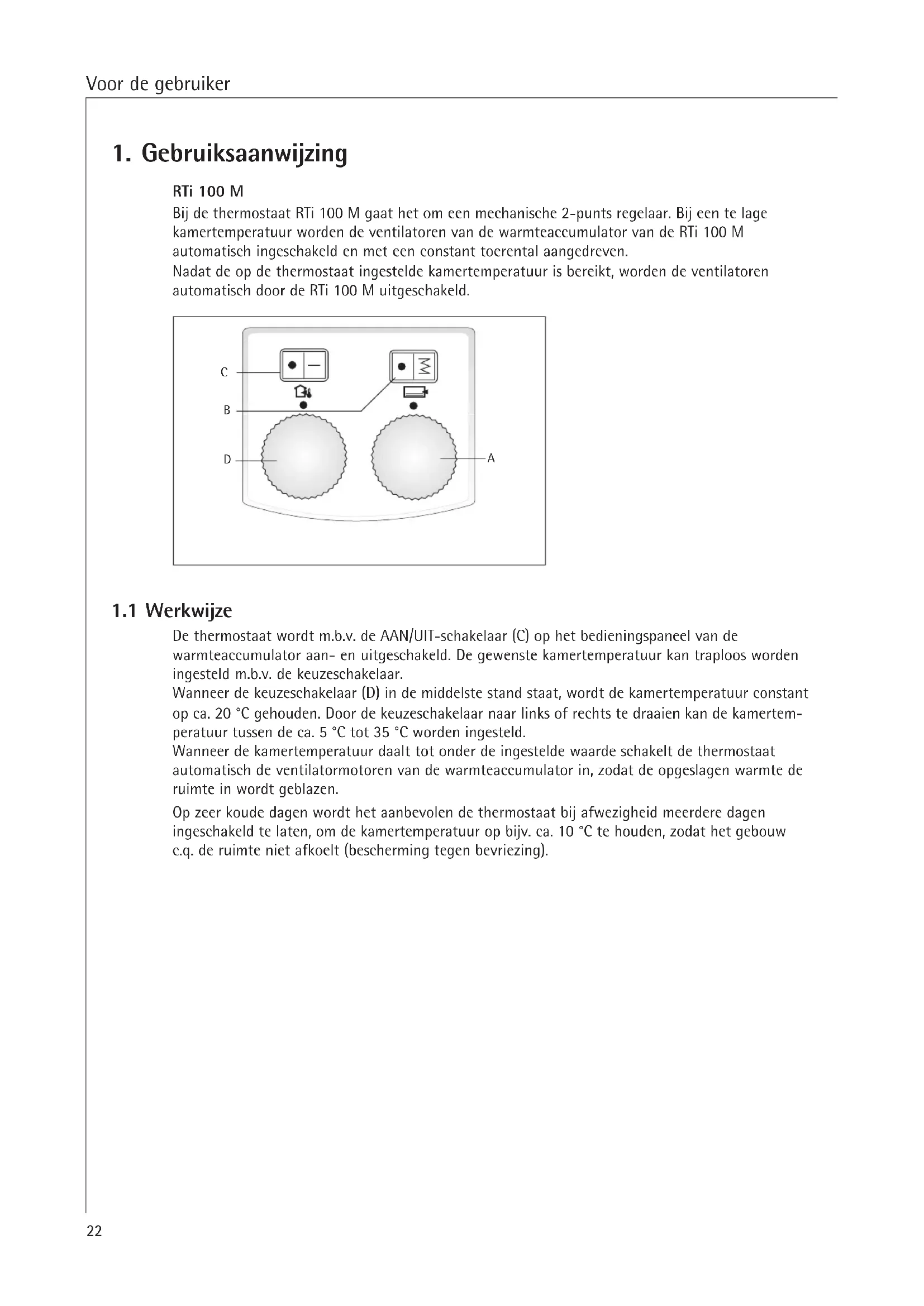 Bij de thermostat RTi 100 M gaat het om een mechanische 2-punts regelaar. Bij een te lage kamertemperatuur worden de ventilatoren van de warmteaccumulator van de RTi 100 M automatisch ingeschakeld en met een constant toerental aangedreten.