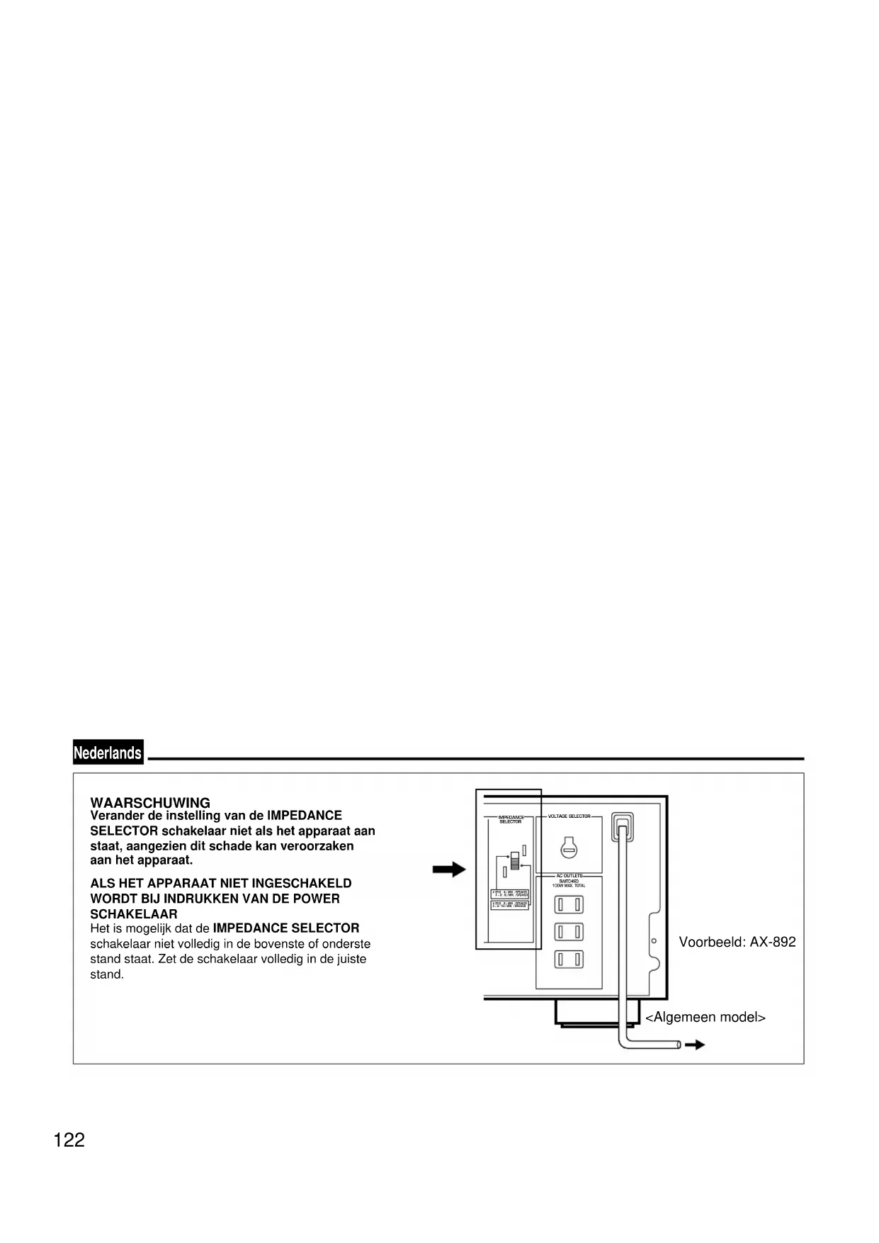 SCHAKELAAR Het is mogelijk dat de IMPEDANCE SELECTOR schakelaar niet volledig in de bovenste of onderste stand staat. Zet de schakelaar volledig in de juiste stand. IMPEDANCE SELECTOR AC OUTLETS SWITCHIED