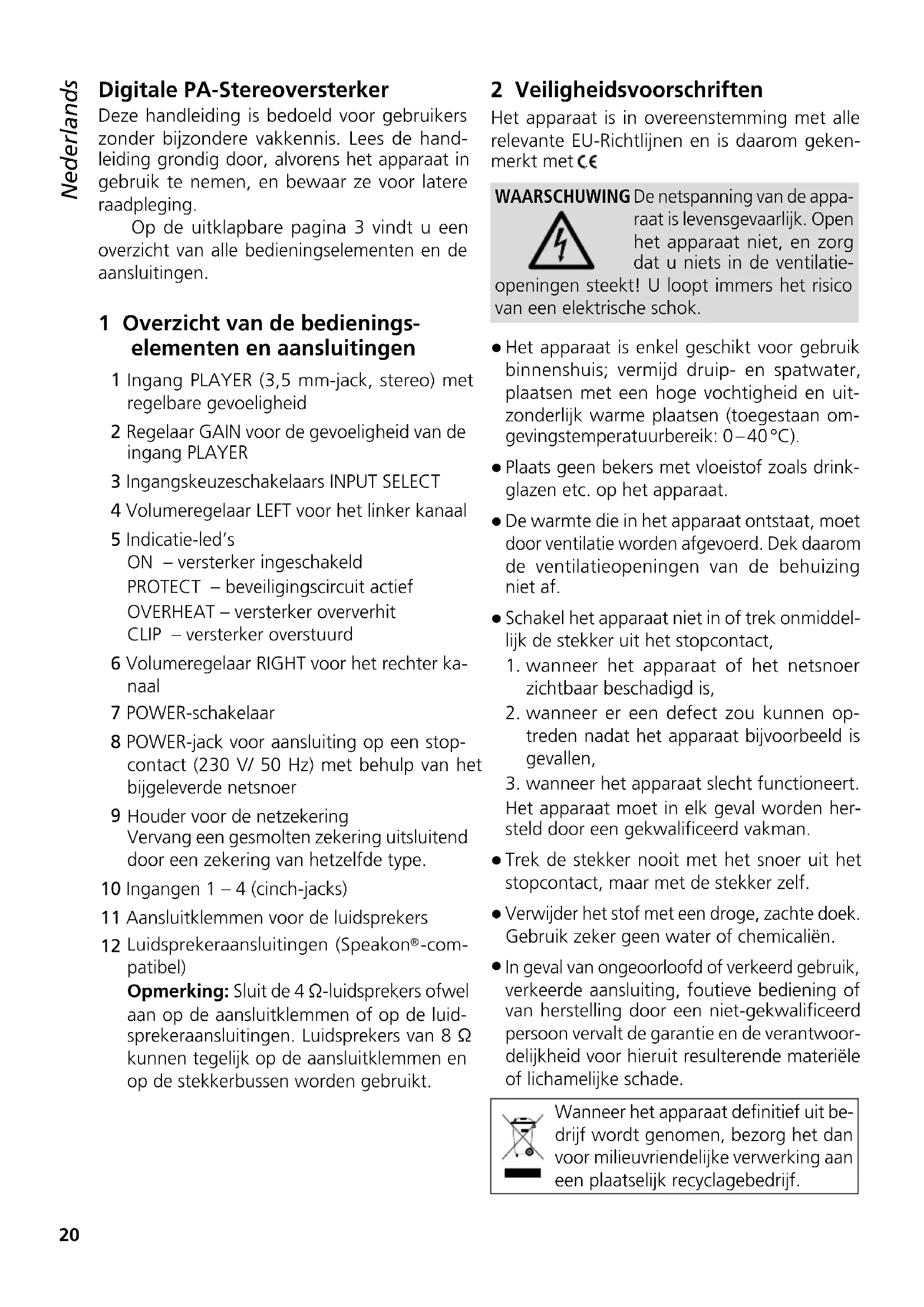 INTERNATIONAL GmbH & Co. KG si riserva ogni diritto di elaborazione in qualsiasi forma delle presenti istruzioni per l’uso. La riproduzione – anche parziale – per propri scopi commerciali è vietata.1920 Nederlands Deutsch Deutsch Seite English English Page Français Français Page Italiano Italiano Pagina Español Español Página Polski Polski Strona Nederlands Nederlands Pagina Digitale PA-Stereoversterker Deze handleiding is bedoeld voor gebruikers zonder bijzondere vakkennis. Lees de hand- leiding grondig door, alvorens het apparaat in gebruik te nemen, en bewaar ze voor latere raadpleging. Op de uitklapbare pagina 3 vindt u een overzicht van alle bedieningselementen en de aansluitingen. 1 Overzicht van de bedienings- elementen en aansluitingen