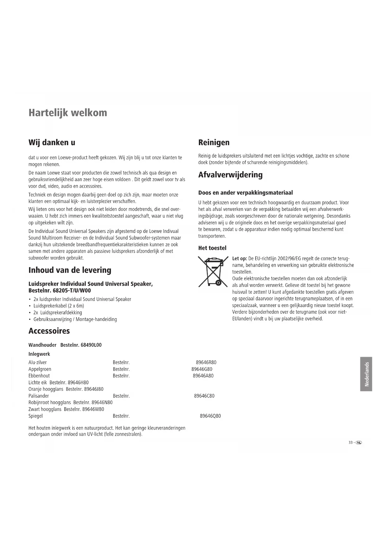 - Gebruiksaanwijzing / Montage-handeiding Accessoires Wandhouder Bestelnr. 68490L00 Inlegwerk Alu-zilver Bestelnr. 89646R80 Appelgroen Bestelnr. 89646G80 Ebbenhout Bestelnr. 89646A80 Lichte eik Bestelnr. 89646H80 Oranje hoogglans Bestelnr. 89646J80 Palisander Bestelnr. 89646C80 Robijnroot hoogglans Bestelnr. 89646N80 Zwart hoogglans Bestelnr. 89646W80 Spiegel Bestelnr. 89646Q80 Het houten inlegwerk is een natuurproduct. Het kan geringe kleurveranderingen ondergaan onder invloed van UV-licht (felle zonnestralen). Reinigen Reinig de luidsprekers uitsluitend met een lichtjes vochtige, zachte en schone doek (zonder bijtende of schurende reinigingsmiddelen). Afvalverwijdering Doos en ander verpakkingsmateriaal U hebt gekozen voor een technisch hoogwaardig en duurzaam product. Voor het als afval verwerken van de verpakking betaalden wij een afvalverwerk- ingsbijdrage, zoals voorgeschreven door de nationale wetgeving. Desondanks adviseren wij u de originele doos en het overige verpakkingsmateriaal goed te bewaren, zodat u de apparatuur indien nodig optimaal beschermd kunt transporteren. Het toestel Let op: De EU-richtlijn 2002/96/EG regelt de correcte terug- name, behandeling en verwerking van gebruikte elektronische toestellen. Oude elektronische toestellen moeten dan ook afzonderlijk als afval worden verwerkt. Gelieve dit toestel bij het gewone huisvuil te zetten! U kunt afgedankte toestellen gratis afgeven op speciaal daarvoor ingerichte terugnameplaatsen, of in een speciaalzaak, wanneer u een gelijkaardig nieuw toestel koopt. Verdere bijzonderheden over de terugname (ook voor niet- EUlanden) vindt u bij uw plaatselijke overheid.- 34 Nederlands Veiligheidsvoorschriften Met het oog op uw eigen veiligheid en om schade aan uw installatie te voorko- men, is het van belang dat u de onderstaande veiligheidsinstructies leest en in acht neemt: