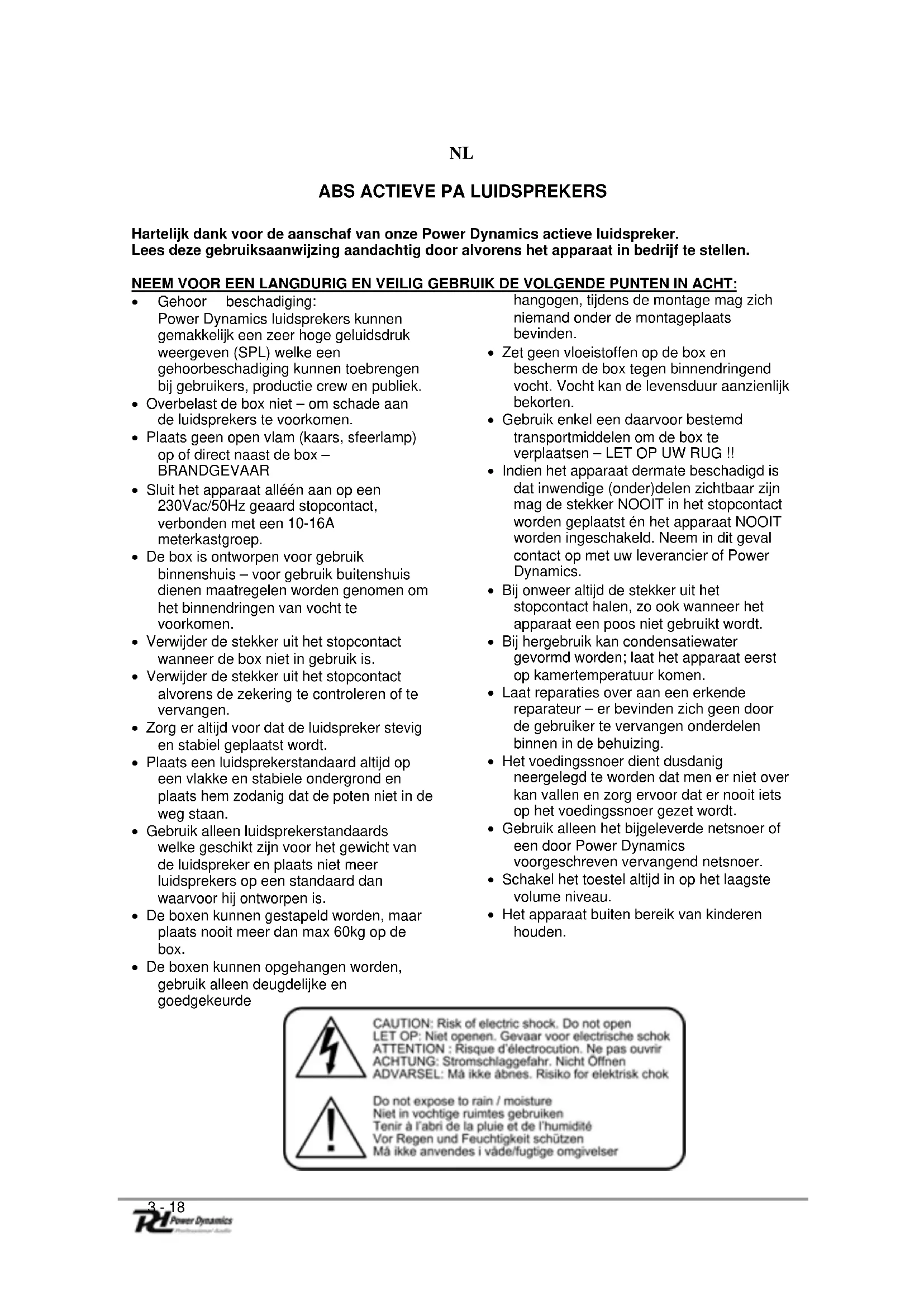 - Gehoor beschadiging: Power Dynamics liquidsprekers können gemakkelijk een zeer hoge geluidsdruk weergeven (SPL) welche een gehoorbeschadiging konnen toebrengen bij gebruikers, productie crew en publiek.