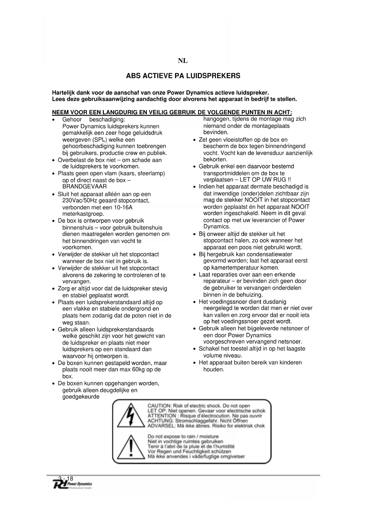 Hartelijk dank voor de aanschaf van onze Power Dynamics actieve luidspreker. Lees deze gebruiksaanwijzing aandachtig door alvorens het apparaat in bedrijf te stellen.