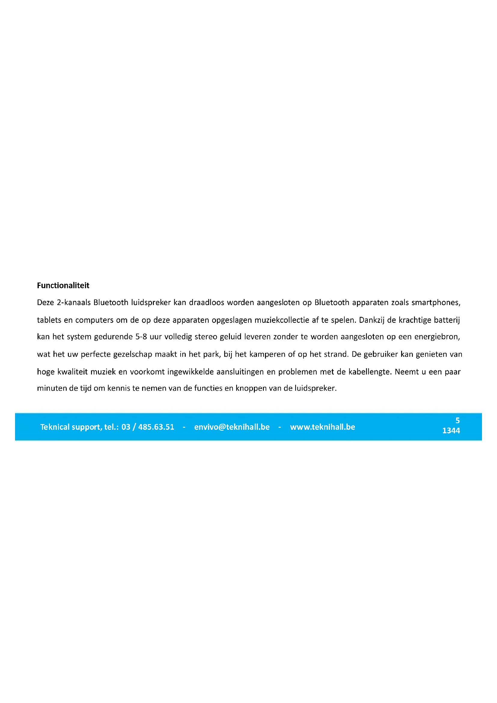 Teknical support, tel.: 03 / 485.63.51 - envivo@teknihall.be - www.teknihall.beFunctionaliteit Deze 2-kanaals Bluetooth luidspreker kan draadloos worden aangesloten op Bluetooth apparaten zoals smartphones, tablets en computers om de op deze apparaten opgeslagen muziekcollectie af te spelen. Dankzij de krachtige batterij kan het system gedurende 5-8 uur volledig stereo geluid leveren zonder te worden aangesloten op een energiebron, wat het uw perfecte gezelschap maakt in het park, bij het kamperen of op het strand. De gebruiker kan genieten van hoge kwaliteit muziek en voorkomt ingewikkelde aansluitingen en problemen met de kabellengte. Neemt u een paar minuten de tijd om kennis te nemen van de functies en knoppen van de luidspreker.