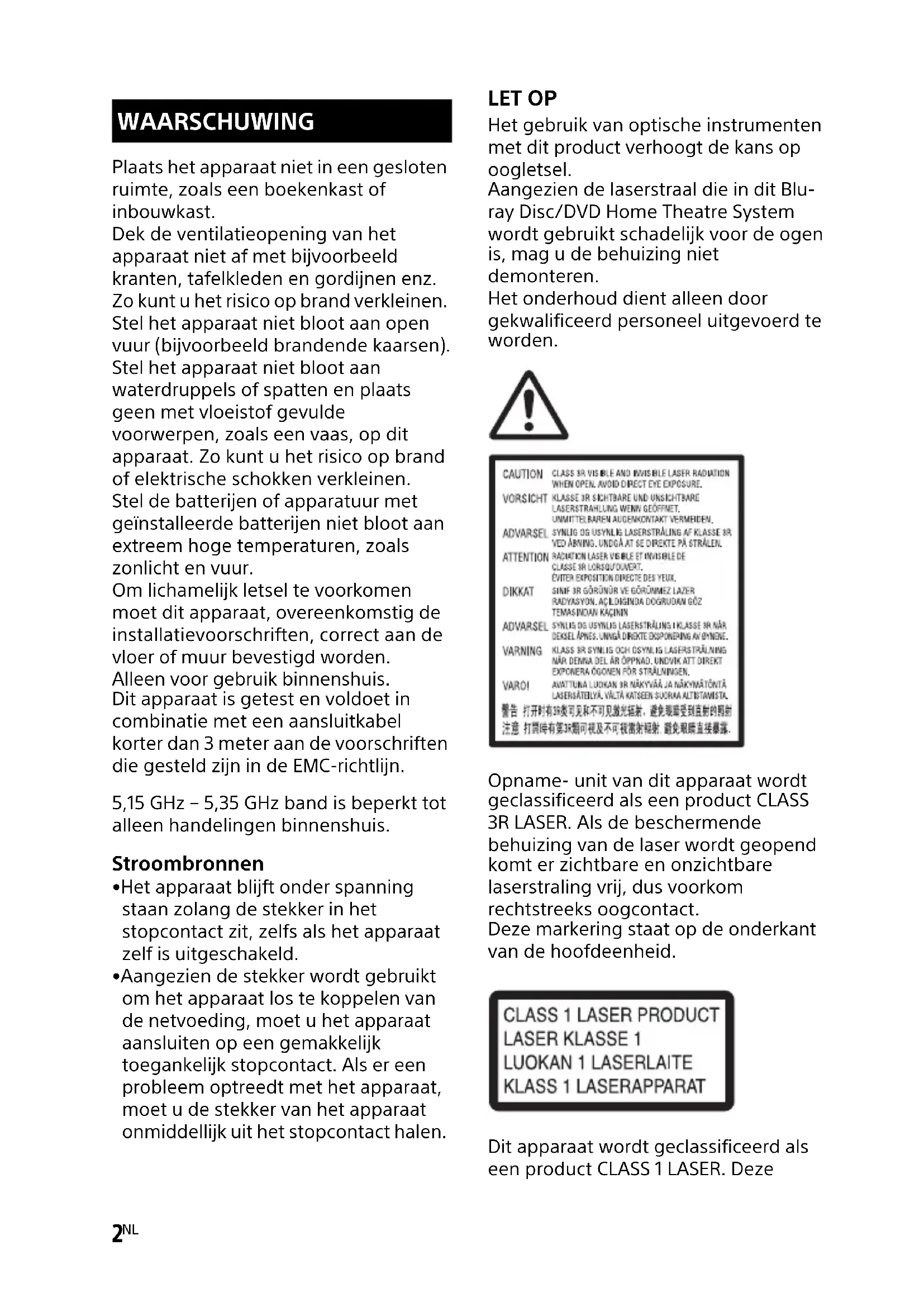 - Aangezien de stekker wordt gebruikt om het apparaat los te koppelen van de netvoeding, moet u het apparaat aansluiten op een gemakkelijk toegankelijk stopcontact. Als er een probleem optreedt met het apparaat, moet u de stekker van het apparaat onmiddellijk uit het stopcontact halen. LET OP Het gebruik van optische instrumenten met dit product verhoogt de kans op oogletsel. Aangezien de laserstraal die in dit Blu- ray Disc/DVD Home Theatre System wordt gebruikt schadelijk voor de ogen is, mag u de behuizing niet demonteren. Het onderhoud dient alleen door gekwalificeerd personeel uitgevoerd te worden. Opname- unit van dit apparaat wordt geclassificeerd als een product CLASS 3R LASER. Als de beschermende behuizing van de laser wordt geopend komt er zichtbare en onzichtbare laserstraling vrij, dus voorkom rechtstreeks oogcontact. Deze markering staat op de onderkant van de hoofdeenheid. Dit apparaat wordt geclassificeerd als een product CLASS 1 LASER. Deze WAARSCHUWINGD:\NORM'S JOB\SONY HA\SO160050\BDV-N9200_7200_5200_Ref (PMRF 05)\4485833161_GBFRESDENLITPL (CEK)\NL\020REG.fm masterpage: Right