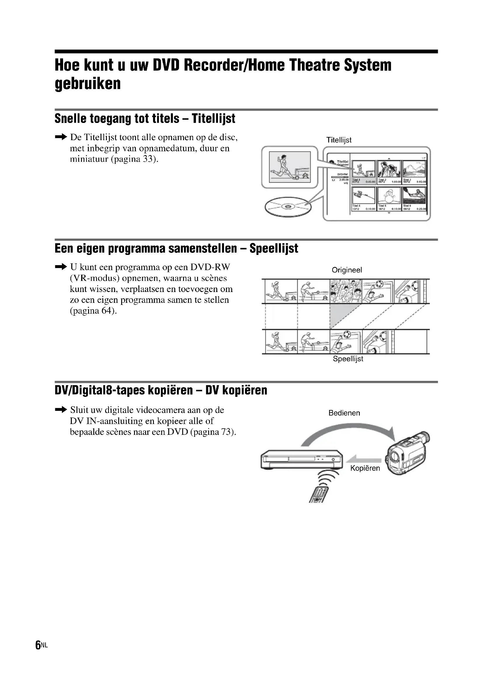 Hoe kunt u uw DVD Recorder/Home Theatre System gebruiken Snelle toegang tot titels – Titellijst , De Titellijst toont alle opnamen op de disc, met inbegrip van opnamedatum, duur en miniatuur (pagina 33). Een eigen programma samenstellen – Speellijst , U kunt een programma op een DVD-RW (VR-modus) opnemen, waarna u scènes kunt wissen, verplaatsen en toevoegen om zo een eigen programma samen te stellen (pagina 64). DV/Digital8-tapes kopiëren – DV kopiëren , Sluit uw digitale videocamera aan op de DV IN-aansluiting en kopieer alle of bepaalde scènes naar een DVD (pagina 73). Titellijst TitellijstOrigineelDVD-RW2:45:00 vrij SLP Titel 1 1/7 07/12 0:45:00Titel 209/12 1:00:00Titel 310/12 0:15:00Titel 413/12 0:10:00Titel 516/12 0:10:00Titel 619/12 0:25:00 Origineel Speellijst Bedienen Kopiëren7
