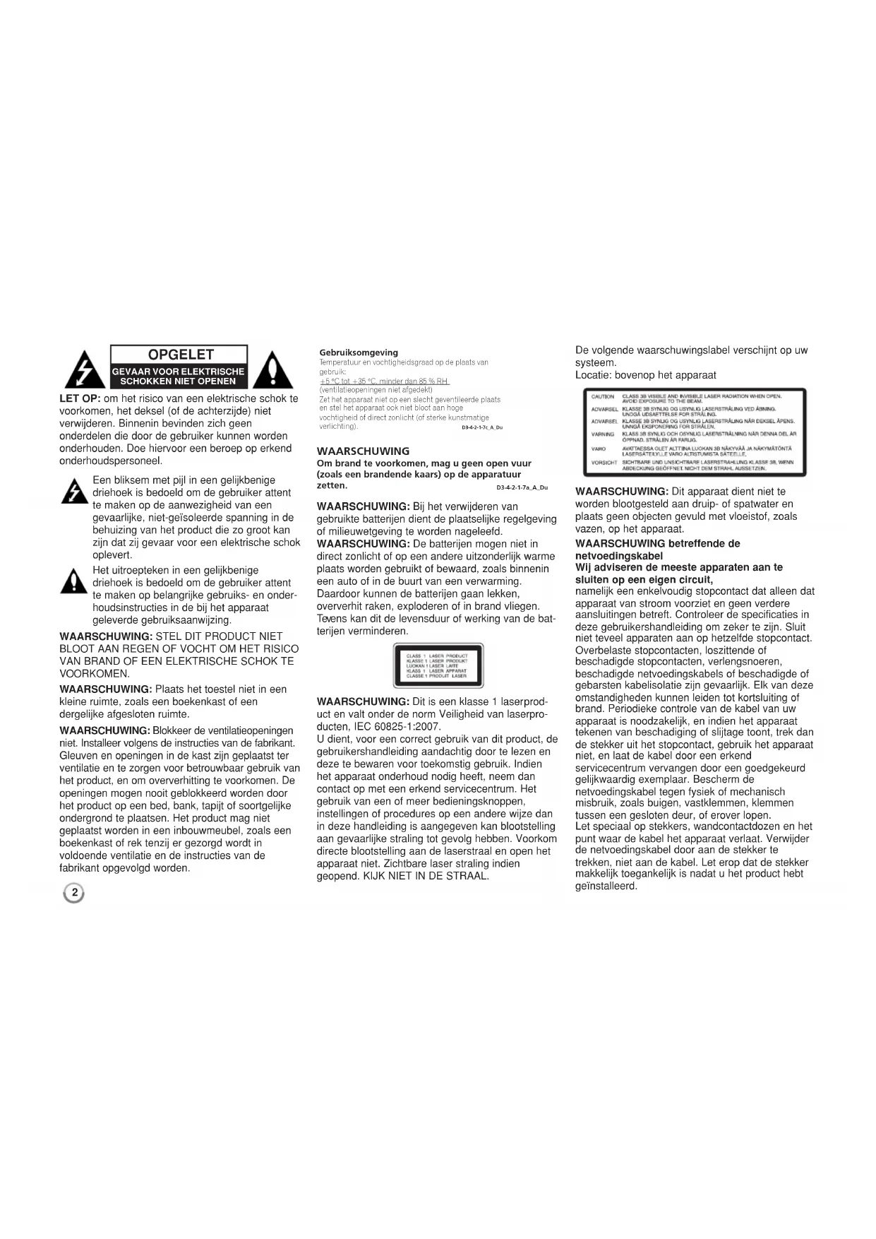 BLOOT AAN REGEN OF VOCHT OM HET RISICO VAN BRAND OF EEN ELEKTRISCHE SCHOK TE VOORKOMEN. WAARSCHUWING: Plaats het toestel niet in een kleine ruimte, zoals een boekenkast of een dergelijke afgesloten ruimte. WAARSCHUWING: Blokkeer de ventilatieopeningen niet. Installeer volgens de instructies van de fabrikant. Gleuven en openingen in de kast zijn geplaatst ter ventilatie en te zorgen voor betrouwbaar gebruik van het product, en om oververhitting te voorkomen. De openingen mogen nooit geblokkeerd worden door het product op een bed, bank, tapijt of soortgelijke ondergrond te plaatsen. Het product mag niet geplaatst worden in een inbouwmeubel, zoals een boekenkast of rek tenzij er gezorgd wordt in voldoende ventilatie en de instructies van de fabrikant opgevolgd worden. WAARSCHUWING: Bij het verwijderen van gebruikte batterijen dient de plaatselijke regelgeving of milieuwetgeving te worden nageleefd. WAARSCHUWING: De batterijen mogen niet in direct zonlicht of op een andere uitzonderlijk warme plaats worden gebruikt of bewaard, zoals binnenin een auto of in de buurt van een verwarming. Daardoor kunnen de batterijen gaan lekken, oververhit raken, exploderen of in brand vliegen. Tevens kan dit de levensduur of werking van de bat- terijen verminderen. WAARSCHUWING: Dit is een klasse 1 laserprod- uct en valt onder de norm Veiligheid van laserpro- ducten, IEC 60825-1:2007. U dient, voor een correct gebruik van dit product, de gebruikershandleiding aandachtig door te lezen en deze te bewaren voor toekomstig gebruik. Indien het apparaat onderhoud nodig heeft, neem dan contact op met een erkend servicecentrum. Het gebruik van een of meer bedieningsknoppen, instellingen of procedures op een andere wijze dan in deze handleiding is aangegeven kan blootstelling aan gevaarlijke straling tot gevolg hebben. Voorkom directe blootstelling aan de laserstraal en open het apparaat niet. Zichtbare laser straling indien geopend. KIJK NIET IN DE STRAAL. De volgende waarschuwingslabel verschijnt op uw systeem. Locatie: bovenop het apparaat WAARSCHUWING: Dit apparaat dient niet te worden blootgesteld aan druip- of spatwater en plaats geen objecten gevuld met vloeistof, zoals vazen, op het apparaat. WAARSCHUWING betreffende de netvoedingskabel Wij adviseren de meeste apparaten aan te sluiten op een eigen circuit, namelijk een enkelvoudig stopcontact dat alleen dat apparaat van stroom voorziet en geen verdere aansluitingen betreft. Controleer de specificaties in deze gebruikershandleiding om zeker te zijn. Sluit niet teveel apparaten aan op hetzelfde stopcontact. Overbelaste stopcontacten, loszittende of beschadigde stopcontacten, verlengsnoeren, beschadigde netvoedingskabels of beschadigde of gebarsten kabelisolatie zijn gevaarlijk. Elk van deze omstandigheden kunnen leiden tot kortsluiting of brand. Periodieke controle van de kabel van uw apparaat is noodzakelijk, en indien het apparaat tekenen van beschadiging of slijtage toont, trek dan de stekker uit het stopcontact, gebruik het apparaat niet, en laat de kabel door een erkend servicecentrum vervangen door een goedgekeurd gelijkwaardig exemplaar. Bescherm de netvoedingskabel tegen fysiek of mechanisch misbruik, zoals buigen, vastklemmen, klemmen tussen een gesloten deur, of erover lopen. Let speciaal op stekkers, wandcontactdozen en het punt waar de kabel het apparaat verlaat. Verwijder de netvoedingskabel door aan de stekker te trekken, niet aan de kabel. Let erop dat de stekker makkelijk toegankelijk is nadat u het product hebt geïnstalleerd. WAARSCHUWING Om brand te voorkomen, mag u geen open vuur (zoals een brandende kaars) op de apparatuur zetten. D3-4-2-1-7a_A_DuGebruiksomgeving