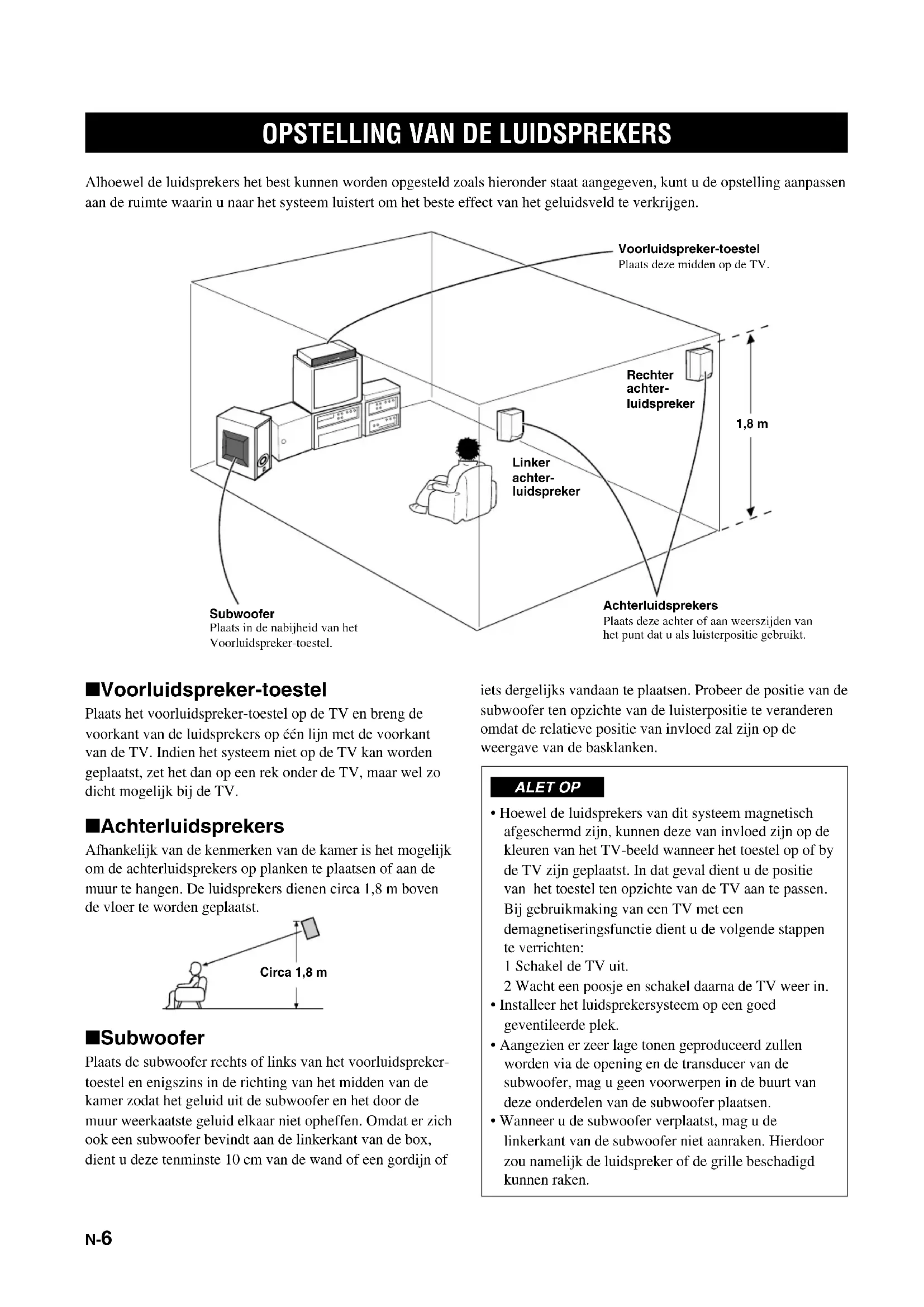 - Deze luidspreker is magnetisch afgeschermd. Desondanks kan op sommige TV-toestellen magnetische vervorming van het beeld optreden, al naar gelang het type TV of de opstelling van het toestel. In dergelijke gevallen kan de storing worden verholpen door het toestel verder van de TV te plaatsen.