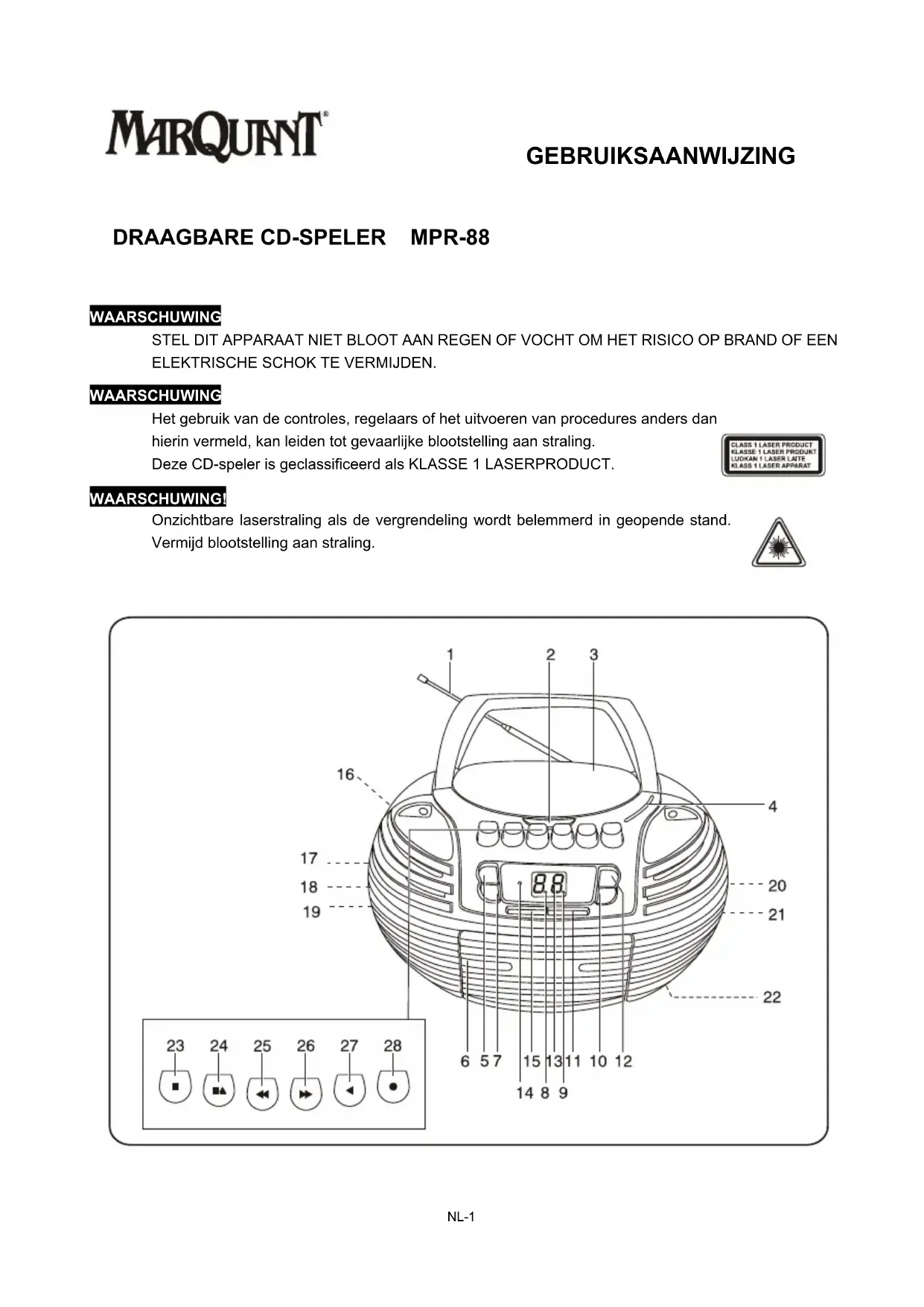 Het gebruik van de controles, regelaars of het uitvoeren van procedures anders dan hierin vermeld, kan leiden tot gevaarlijke bloatstelling aan straling. Deze CD-speler is geclassified erd als KLASSE 1 LASERPRODUCT.