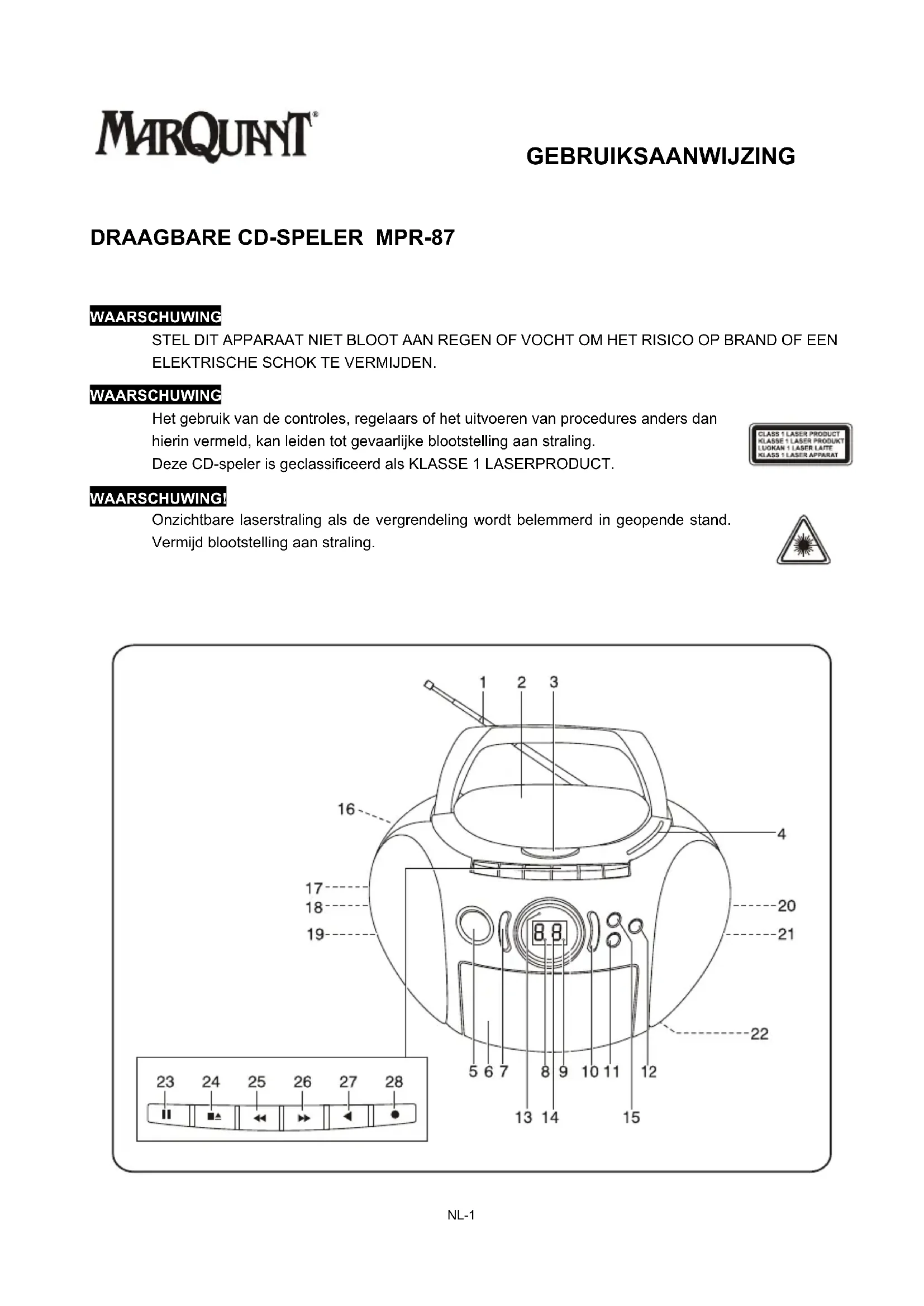 WAARSCHUWING STEL DIT APPARAAT NIET BLOOT AAN REGEN OF VOCHT OM HET RISICO OP BRAND OF EEN ELEKTRISCHE SCHOK TE VERMIJDEN. WAARSCHUWING Het gebruik van de controles, regelaars of het uitvoeren van procedures anders dan hierin vermeld, kan leiden tot gevaarlijke blootstelling aan straling. Deze CD-speler is geclassificeerd als KLASSE 1 LASERPRODUCT. WAARSCHUWING! Onzichtbare laserstraling als de vergrendeling wordt belemmerd in geopende stand. Vermijd blootstelling aan straling.NL-2 A BEDIENTOETSEN