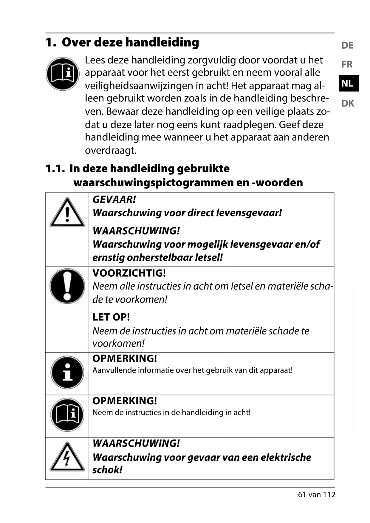 Lees deze handleiding zorgvuldig door voordat u het apparaat voor het eerst gebruikt en neem vooral alle veiligheidsaanwijzingen in acht! Het apparaat mag al- leen gebruikt worden zoals in de handleiding beschre- ven. Bewaar deze handleiding op een veilige plaats zo- dat u deze later nog eens kunt raadplegen. Geef deze handleiding mee wanneer u het apparaat aan anderen overdraagt. 1.1. In deze handleiding gebruikte waarschuwingspictogrammen en -woorden GEVAAR! Waarschuwing voor direct levensgevaar! WAARSCHUWING! Waarschuwing voor mogelijk levensgevaar en/of ernstig onherstelbaar letsel! VOORZICHTIG! Neem alle instructies in acht om letsel en materiële scha- de te voorkomen! LET OP! Neem de instructies in acht om materiële schade te voorkomen! OPMERKING! Aanvullende informatie over het gebruik van dit apparaat! OPMERKING! Neem de instructies in de handleiding in acht! WAARSCHUWING! Waarschuwing voor gevaar van een elektrische schok! 84627_E66281 MULI eCommerce Content Final.indb 6184627_E66281 MULI eCommerce Content Final.indb 61 08.05.2015 08:14:0408.05.2015 08:14:0462 van 112