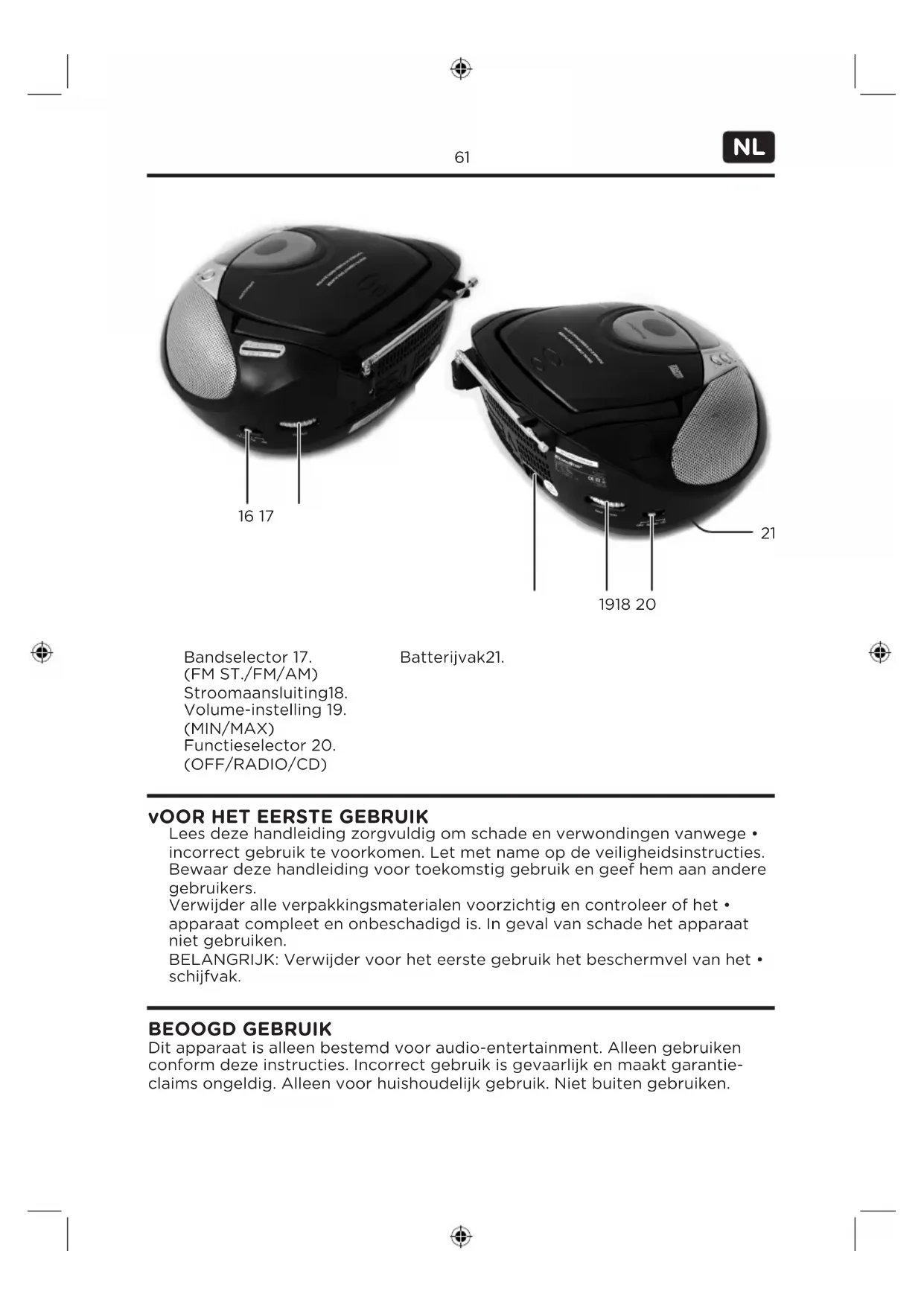BEOOGD GEBRUIk Dit apparaat is alleen bestemd voor audio-entertainment. Alleen gebruiken conform deze instructies. Incorrect gebruik is gevaarlijk en maakt garantie- claims ongeldig. Alleen voor huishoudelijk gebruik. Niet buiten gebruiken. Bandselector 17. (FM ST./FM/AM) Stroomaansluiting18. Volume-instelling 19. (MIN/MAX) Functieselector 20. (OFF/RADIO/CD) Batterijvak21.