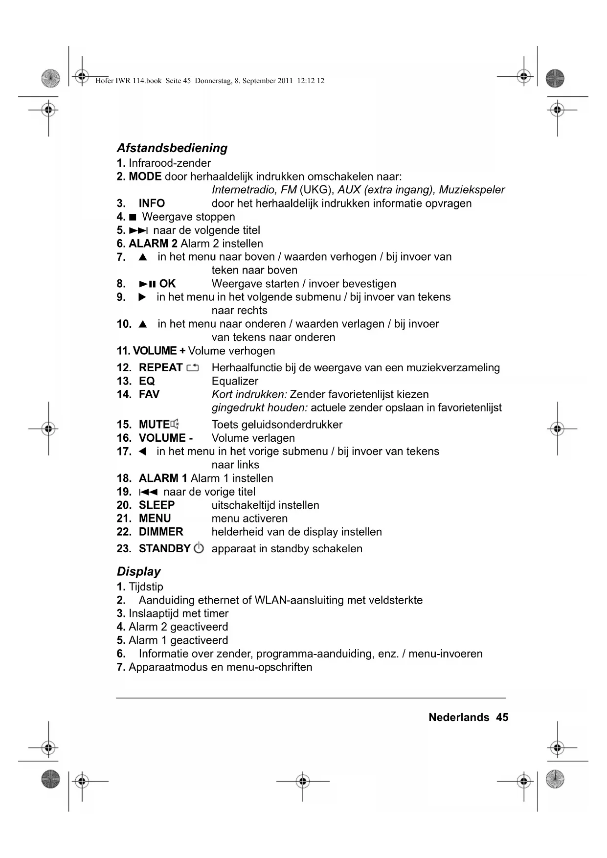 - Zet het toestel zo neer, dat er geen direct zonlicht op valt. Hofer IWR 114.book Seite 46 Donnerstag, 8. September 2011 12:12 12Nederlands 47
